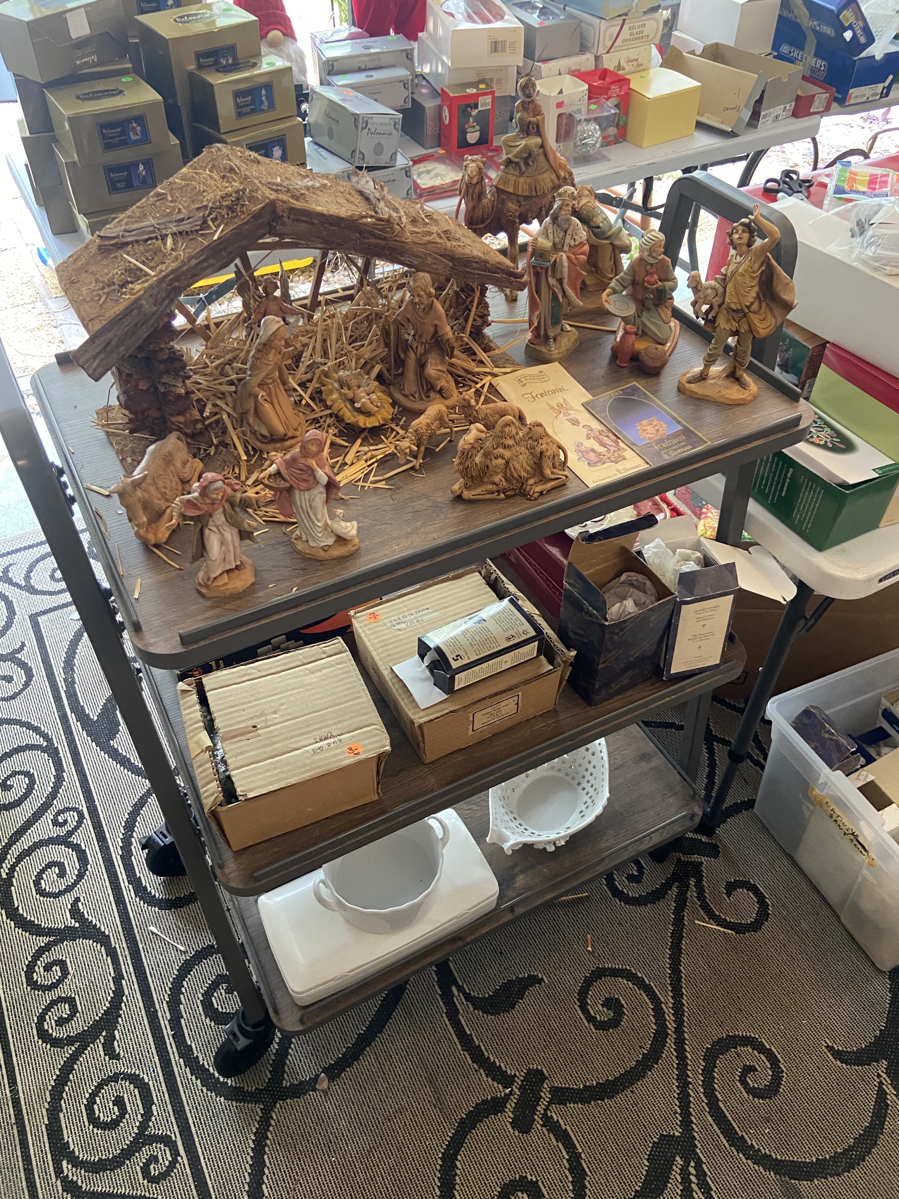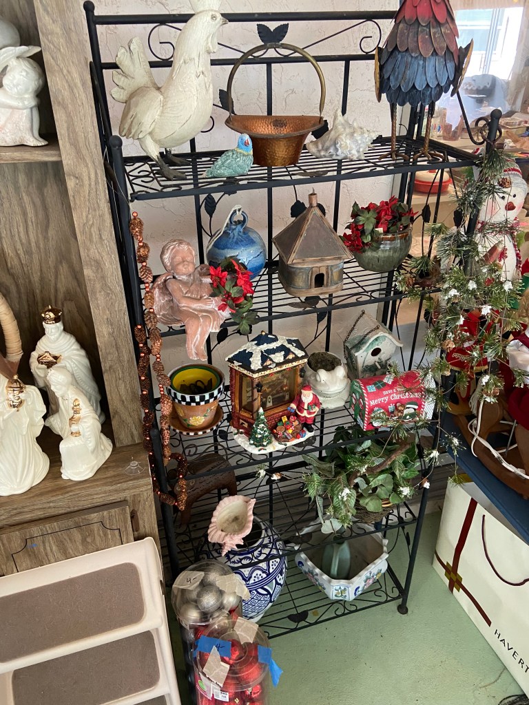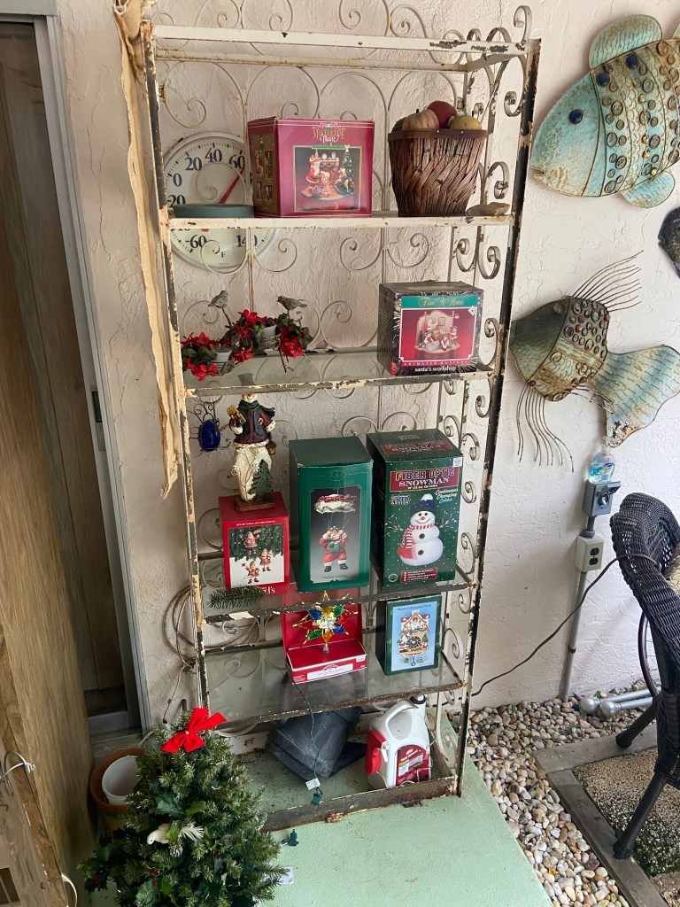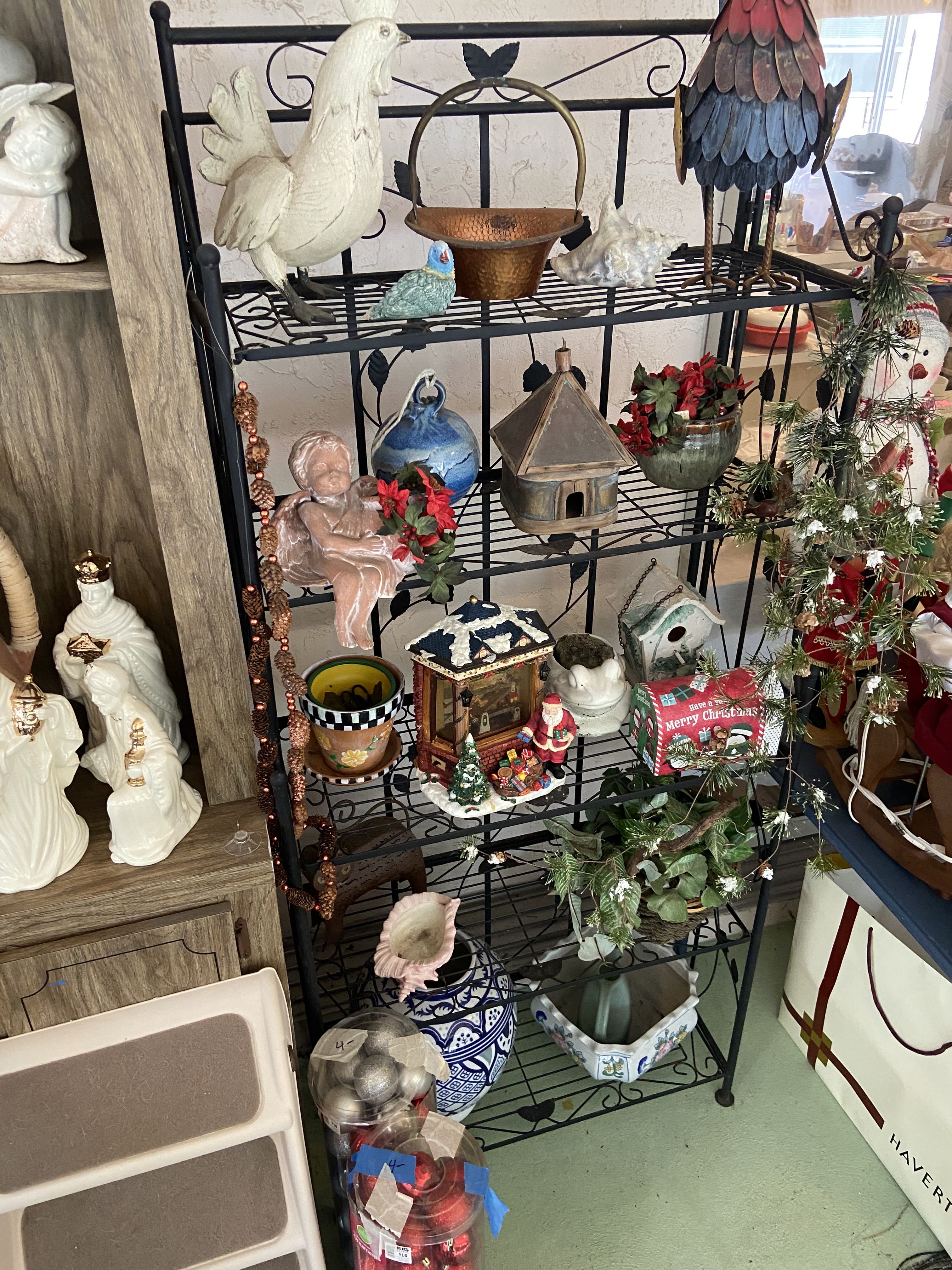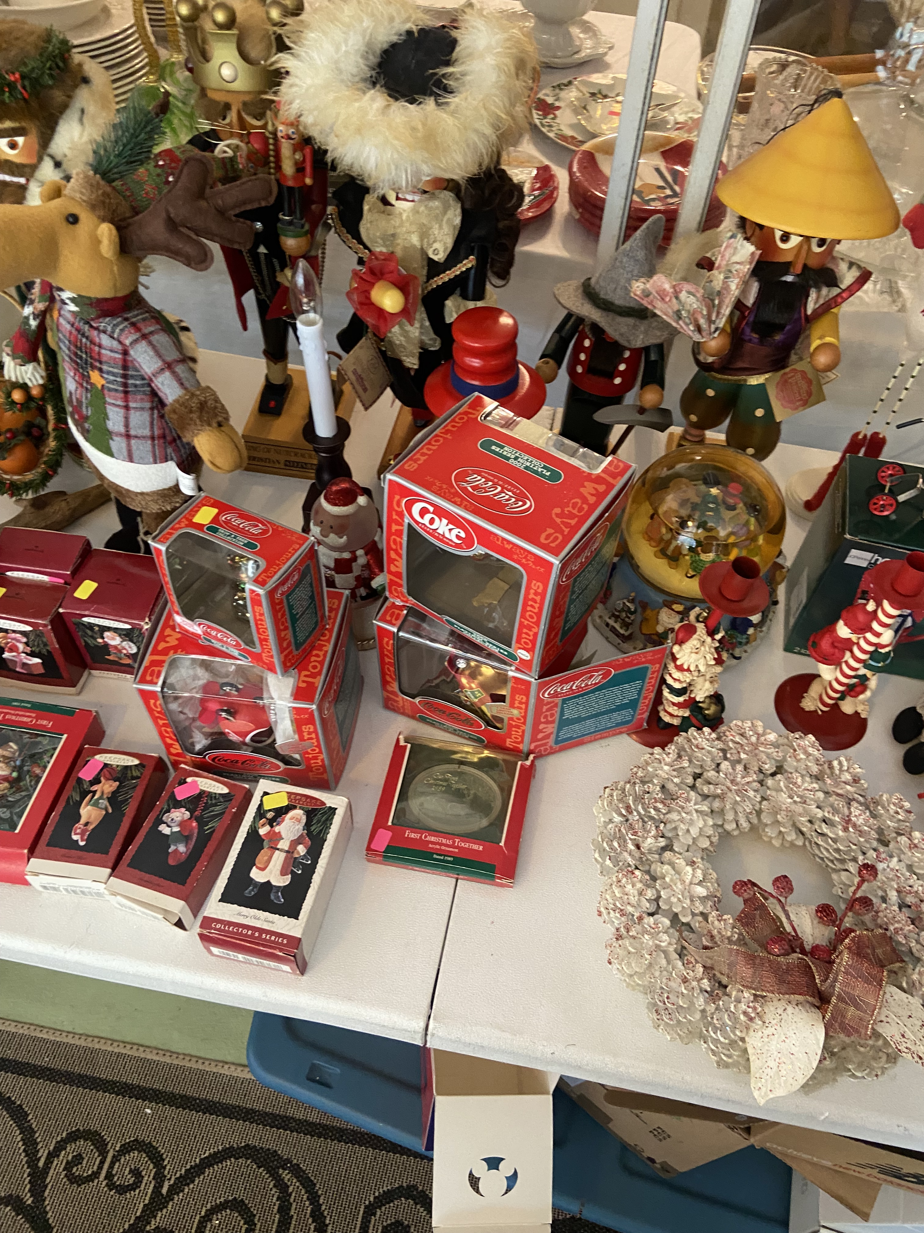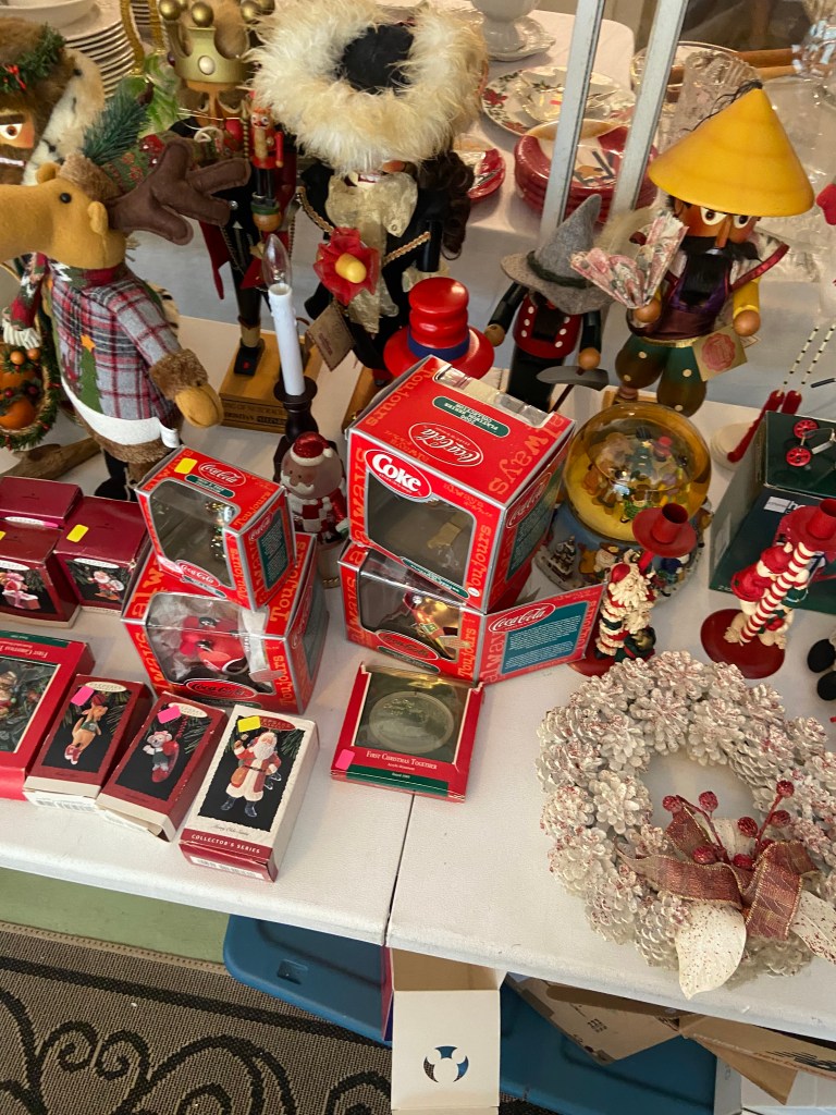 We have Burlington house hutch, marble top buffet, Vintage Collectibles, dining room table with four chairs, Hall tree, Steinbach Nutcracker from Germany, vintage hallway tables, art deco couch, decorator pieces, crystal, large fountain, mid-century armchairs, recliners, three stacking music box tables from Italy, Venus de Milo sculpture, pedestal, mid-century accent tables, curio, model ships, drop leaf dining room, table, and four chairs, marble top sofa table, artwork, CDs, VHS‘s, DVDs, albums, 78s, 45s and cassettes, 50 inch RCA Roku TV, stereo with turntable and cassette player, vintage oriental wooden birdcage, lamps, vases, green sofa, vintage pictures, sculptures, vacuums, room divider, bar area, kitchen, pampered chef, power juicer, Mikasa English Countryside dishes and serving set, vintage Hazel Aras hand painted glass set, glassware, toaster oven, knives and utensils, pots and pans, cookware, serving dishes, roosters, salt and pepper shakers, cups and dishes, canister sets, FA Pawla art Santa Barbara, we have a Christmas wonderland, Fontanini nativity set, department 56, village pieces, ornaments, Santa Claus figures, yard art, Christmas lights, dual patio glider, outdoor chairs, stressless recliner, patio set, storage bins, outdoor wall, art, outdoor cabinets and shelves, Thomasville bedroom set with dresser, high boy, nightstands and headboard, Butler writing desk, linens, high boy dresser, lingerie chest, jewelry boxes, vintage box phone, dolls, stuffed animals, throw pillows, OT fit briefs, shoes, hats, vintage hats, purses, bathroom items, early American dressers, high boy and nightstands, lamps, train sets, Viking Husqvarna sewing machine, bookcases, books, vintage and old books, old sheet music, vintage magazines, cameras, 35 mm cameras, digital cameras, vintage, Disney World, vintage camera accessories, shoe racks, we have hairdressers room, a large number of hairdresser supplies, hair dryer, hairdresser chair, cleaning supplies, art items, garage, three large Coleman storage chess, large Christmas tree, tennis rackets, tools, and much much more.