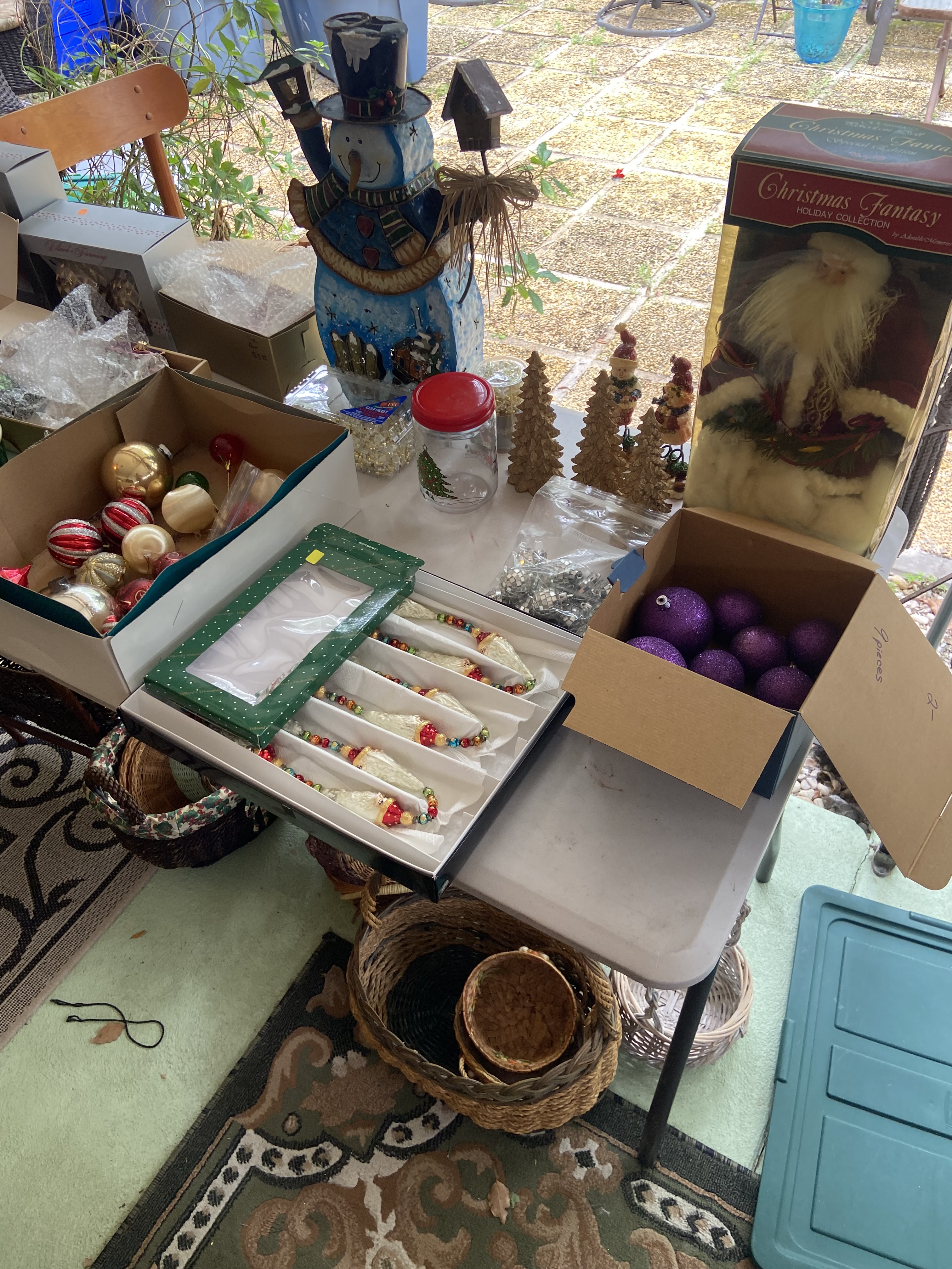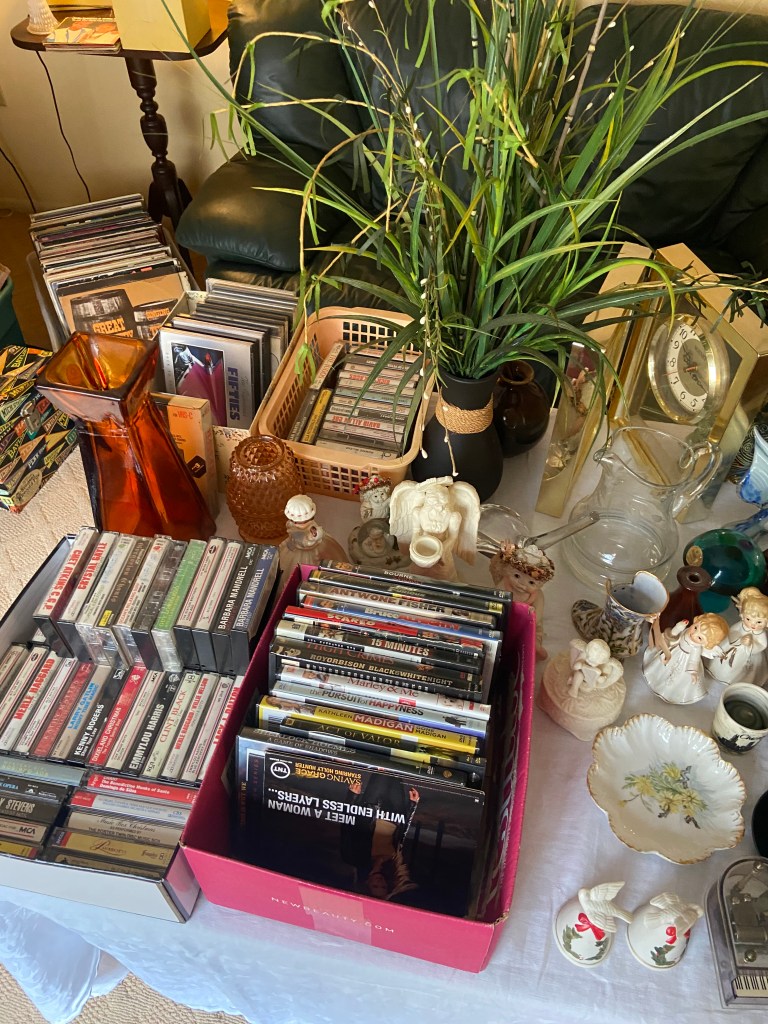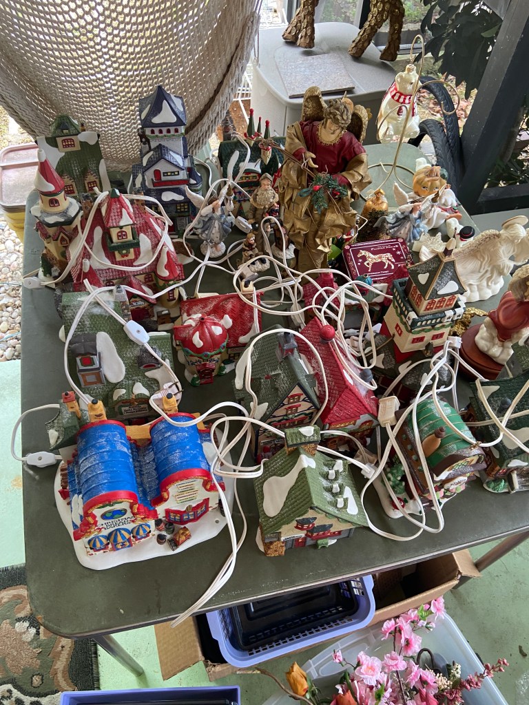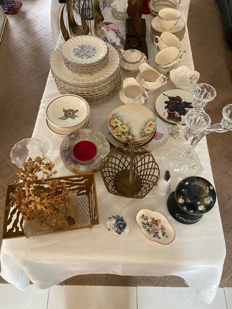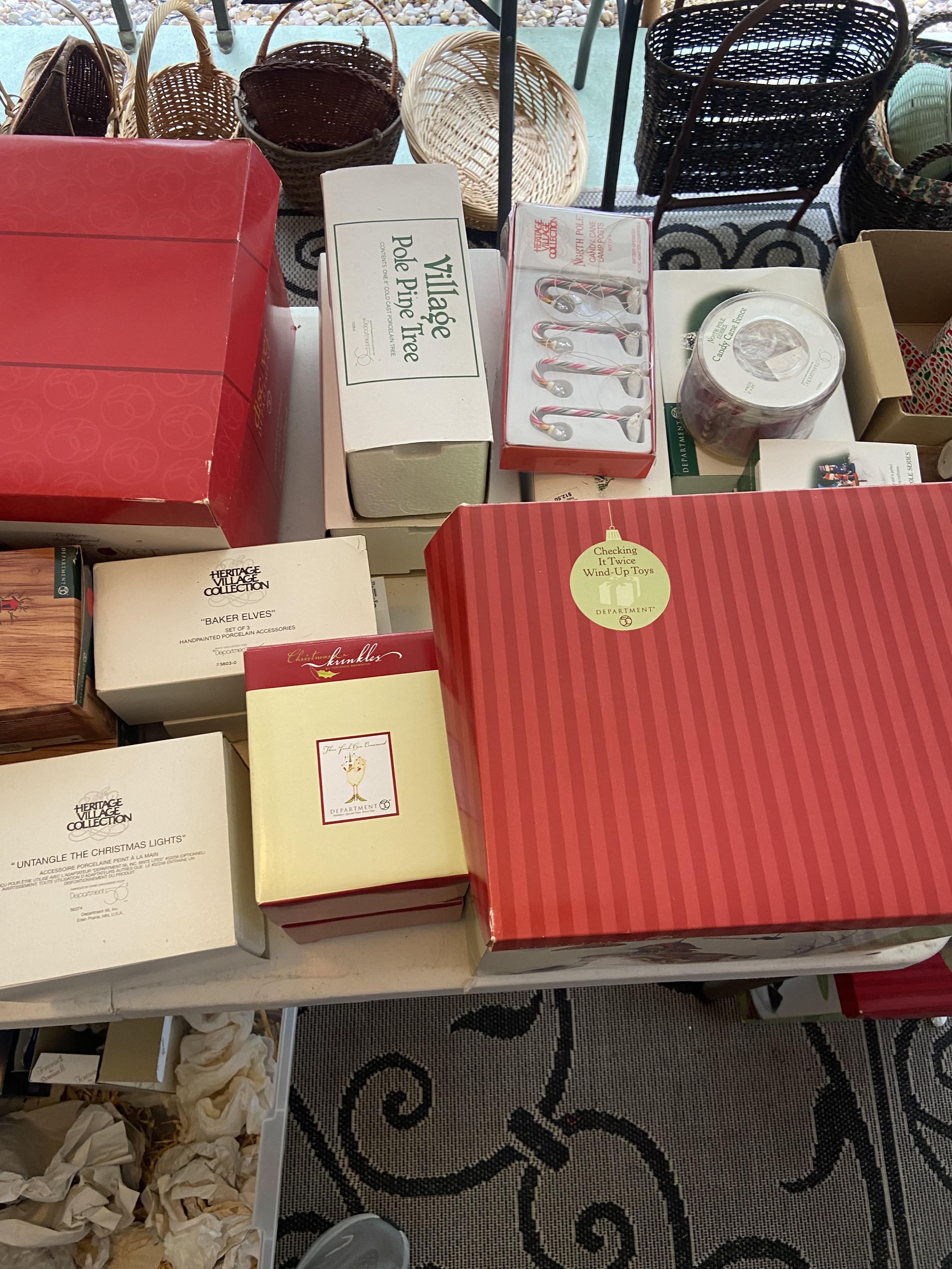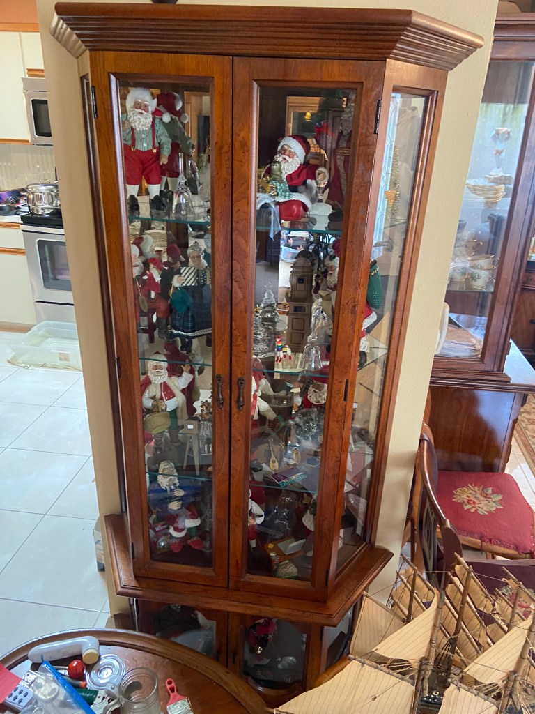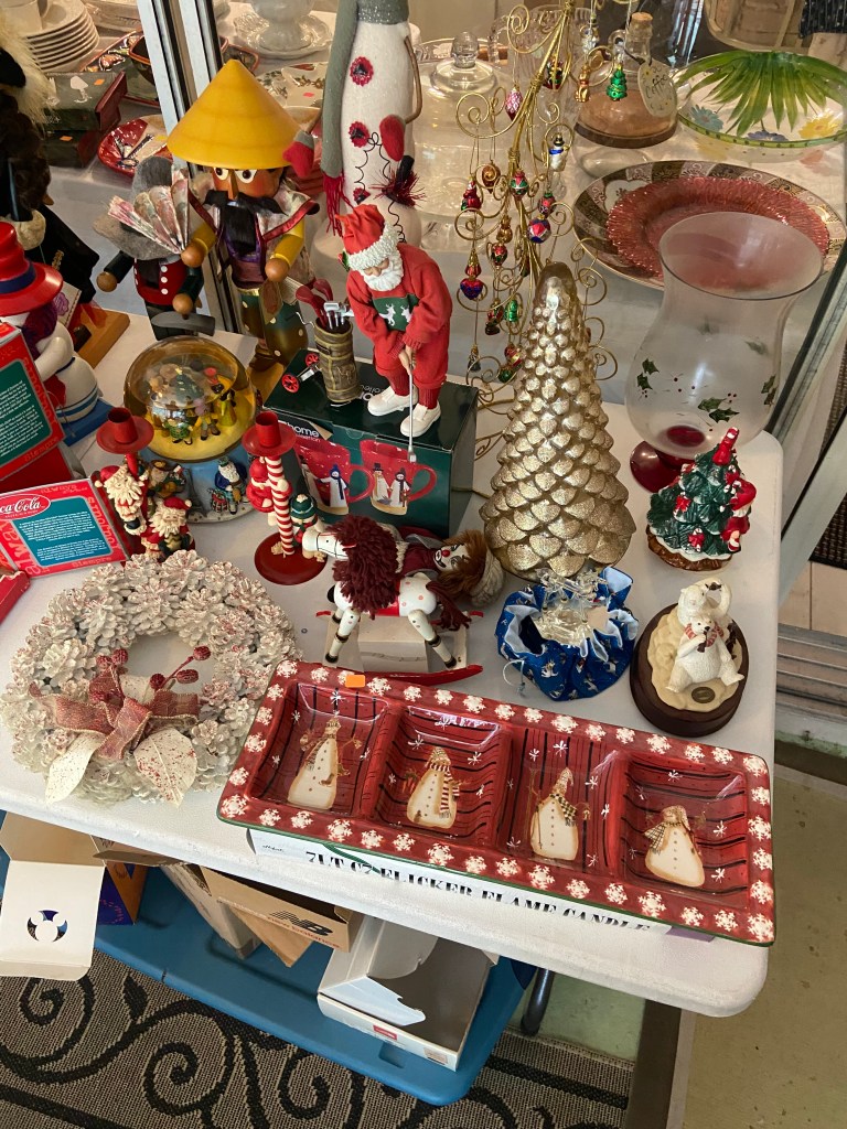 We have Burlington house hutch, marble top buffet, Vintage Collectibles, dining room table with four chairs, Hall tree, Steinbach Nutcracker from Germany, vintage hallway tables, art deco couch, decorator pieces, crystal, large fountain, mid-century armchairs, recliners, three stacking music box tables from Italy, Venus de Milo sculpture, pedestal, mid-century accent tables, curio, model ships, drop leaf dining room, table, and four chairs, marble top sofa table, artwork, CDs, VHS‘s, DVDs, albums, 78s, 45s and cassettes, 50 inch RCA Roku TV, stereo with turntable and cassette player, vintage oriental wooden birdcage, lamps, vases, green sofa, vintage pictures, sculptures, vacuums, room divider, bar area, kitchen, pampered chef, power juicer, Mikasa English Countryside dishes and serving set, vintage Hazel Aras hand painted glass set, glassware, toaster oven, knives and utensils, pots and pans, cookware, serving dishes, roosters, salt and pepper shakers, cups and dishes, canister sets, FA Pawla art Santa Barbara, we have a Christmas wonderland, Fontanini nativity set, department 56, village pieces, ornaments, Santa Claus figures, yard art, Christmas lights, dual patio glider, outdoor chairs, stressless recliner, patio set, storage bins, outdoor wall, art, outdoor cabinets and shelves, Thomasville bedroom set with dresser, high boy, nightstands and headboard, Butler writing desk, linens, high boy dresser, lingerie chest, jewelry boxes, vintage box phone, dolls, stuffed animals, throw pillows, OT fit briefs, shoes, hats, vintage hats, purses, bathroom items, early American dressers, high boy and nightstands, lamps, train sets, Viking Husqvarna sewing machine, bookcases, books, vintage and old books, old sheet music, vintage magazines, cameras, 35 mm cameras, digital cameras, vintage, Disney World, vintage camera accessories, shoe racks, we have hairdressers room, a large number of hairdresser supplies, hair dryer, hairdresser chair, cleaning supplies, art items, garage, three large Coleman storage chess, large Christmas tree, tennis rackets, tools, and much much more.