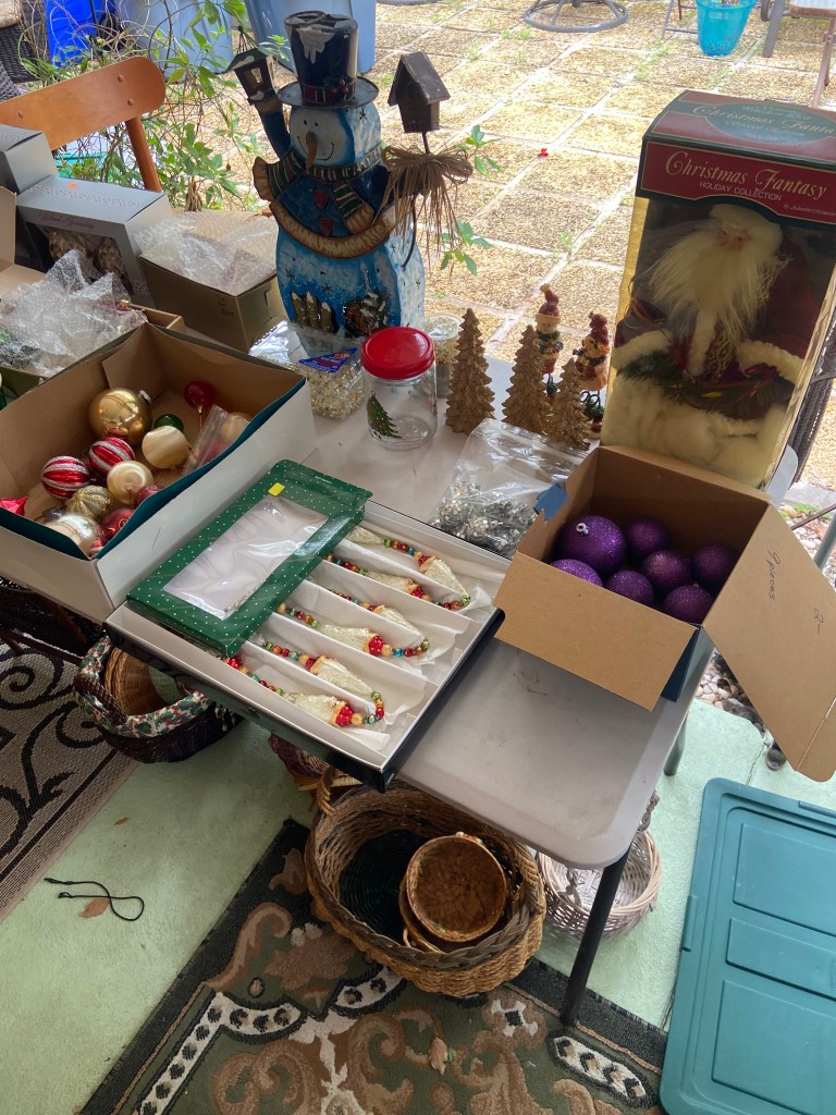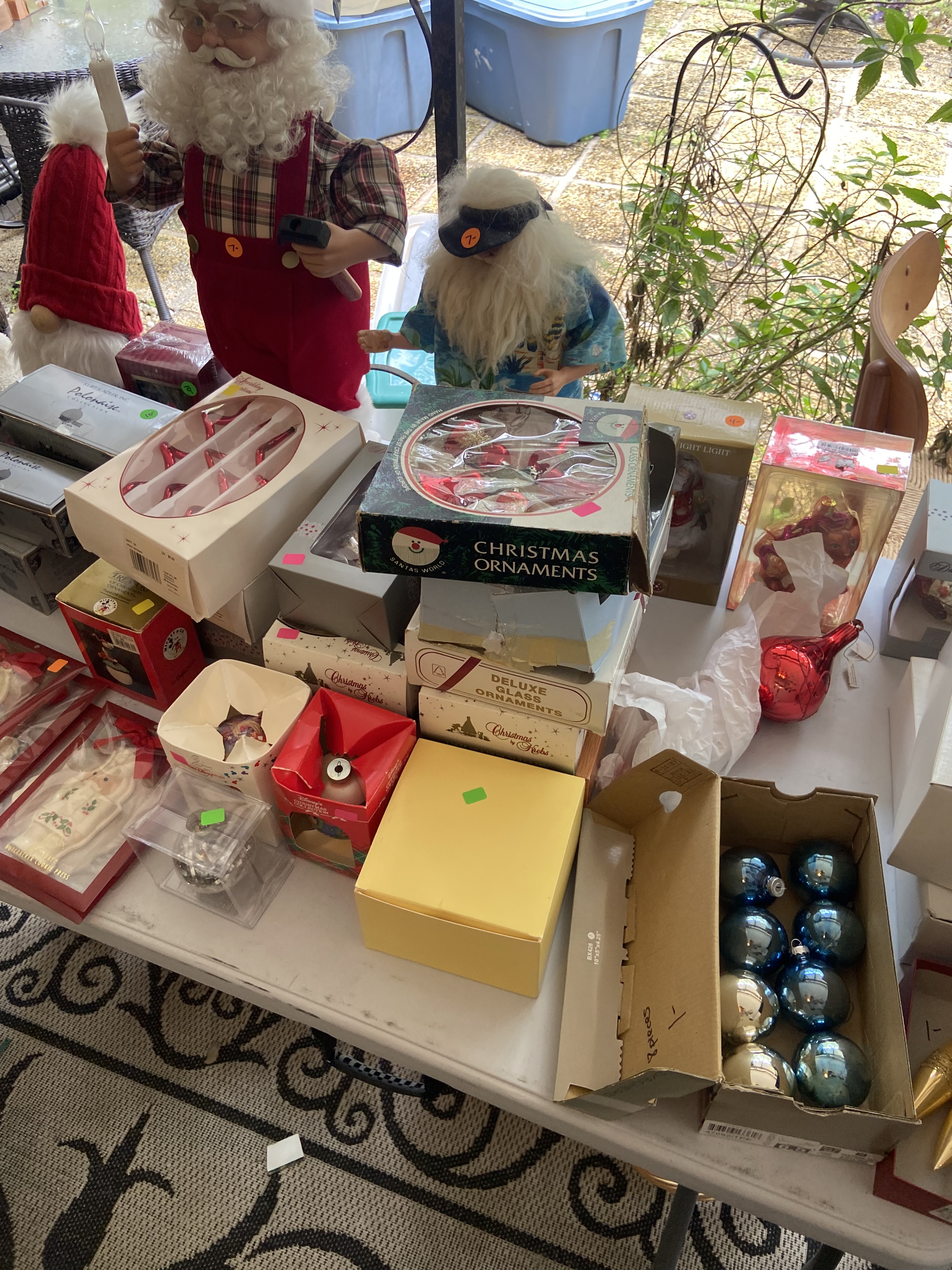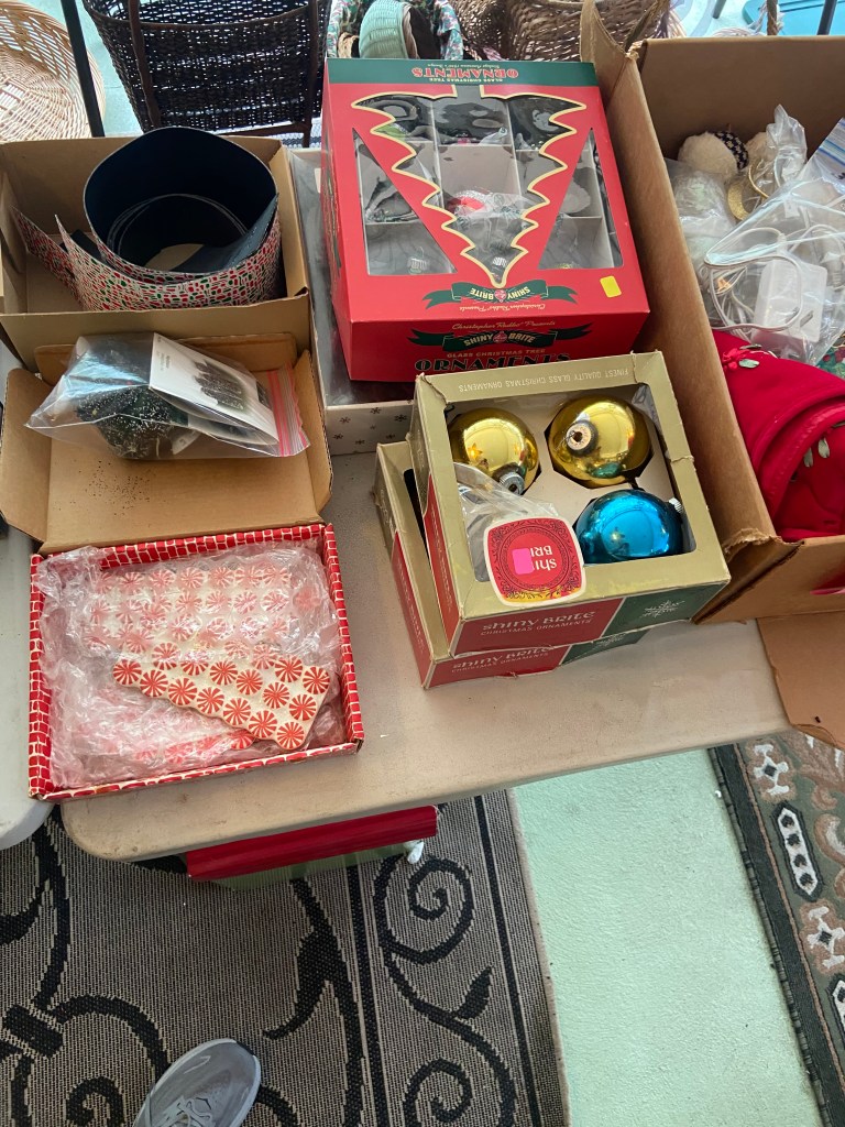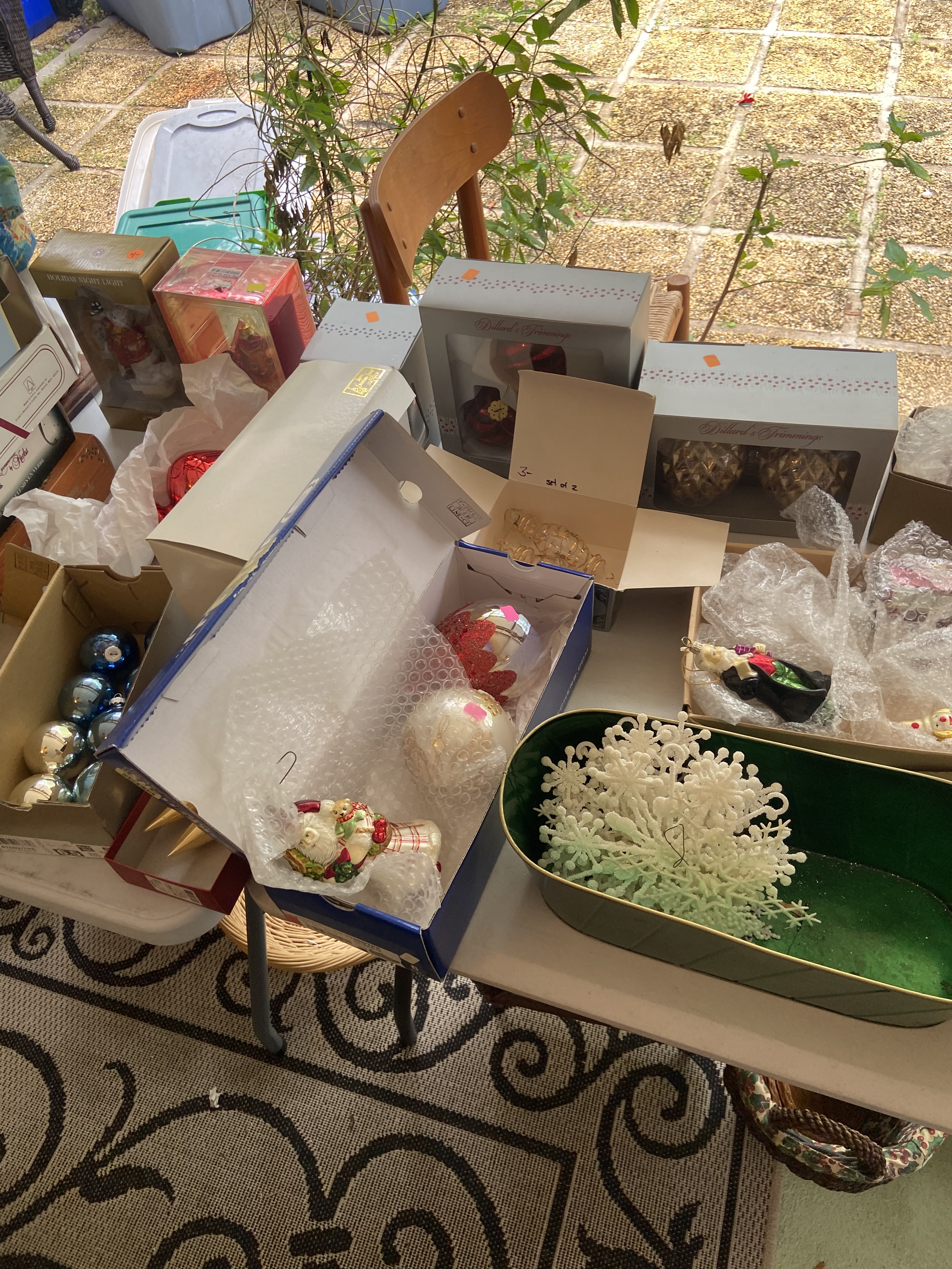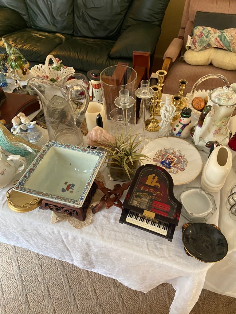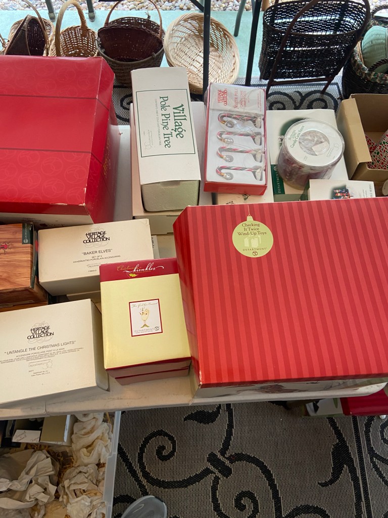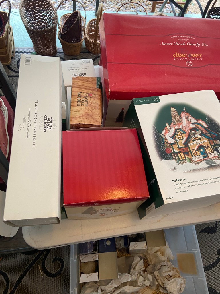 We have Burlington house hutch, marble top buffet, Vintage Collectibles, dining room table with four chairs, Hall tree, Steinbach Nutcracker from Germany, vintage hallway tables, art deco couch, decorator pieces, crystal, large fountain, mid-century armchairs, recliners, three stacking music box tables from Italy, Venus de Milo sculpture, pedestal, mid-century accent tables, curio, model ships, drop leaf dining room, table, and four chairs, marble top sofa table, artwork, CDs, VHS‘s, DVDs, albums, 78s, 45s and cassettes, 50 inch RCA Roku TV, stereo with turntable and cassette player, vintage oriental wooden birdcage, lamps, vases, green sofa, vintage pictures, sculptures, vacuums, room divider, bar area, kitchen, pampered chef, power juicer, Mikasa English Countryside dishes and serving set, vintage Hazel Aras hand painted glass set, glassware, toaster oven, knives and utensils, pots and pans, cookware, serving dishes, roosters, salt and pepper shakers, cups and dishes, canister sets, FA Pawla art Santa Barbara, we have a Christmas wonderland, Fontanini nativity set, department 56, village pieces, ornaments, Santa Claus figures, yard art, Christmas lights, dual patio glider, outdoor chairs, stressless recliner, patio set, storage bins, outdoor wall, art, outdoor cabinets and shelves, Thomasville bedroom set with dresser, high boy, nightstands and headboard, Butler writing desk, linens, high boy dresser, lingerie chest, jewelry boxes, vintage box phone, dolls, stuffed animals, throw pillows, OT fit briefs, shoes, hats, vintage hats, purses, bathroom items, early American dressers, high boy and nightstands, lamps, train sets, Viking Husqvarna sewing machine, bookcases, books, vintage and old books, old sheet music, vintage magazines, cameras, 35 mm cameras, digital cameras, vintage, Disney World, vintage camera accessories, shoe racks, we have hairdressers room, a large number of hairdresser supplies, hair dryer, hairdresser chair, cleaning supplies, art items, garage, three large Coleman storage chess, large Christmas tree, tennis rackets, tools, and much much more.