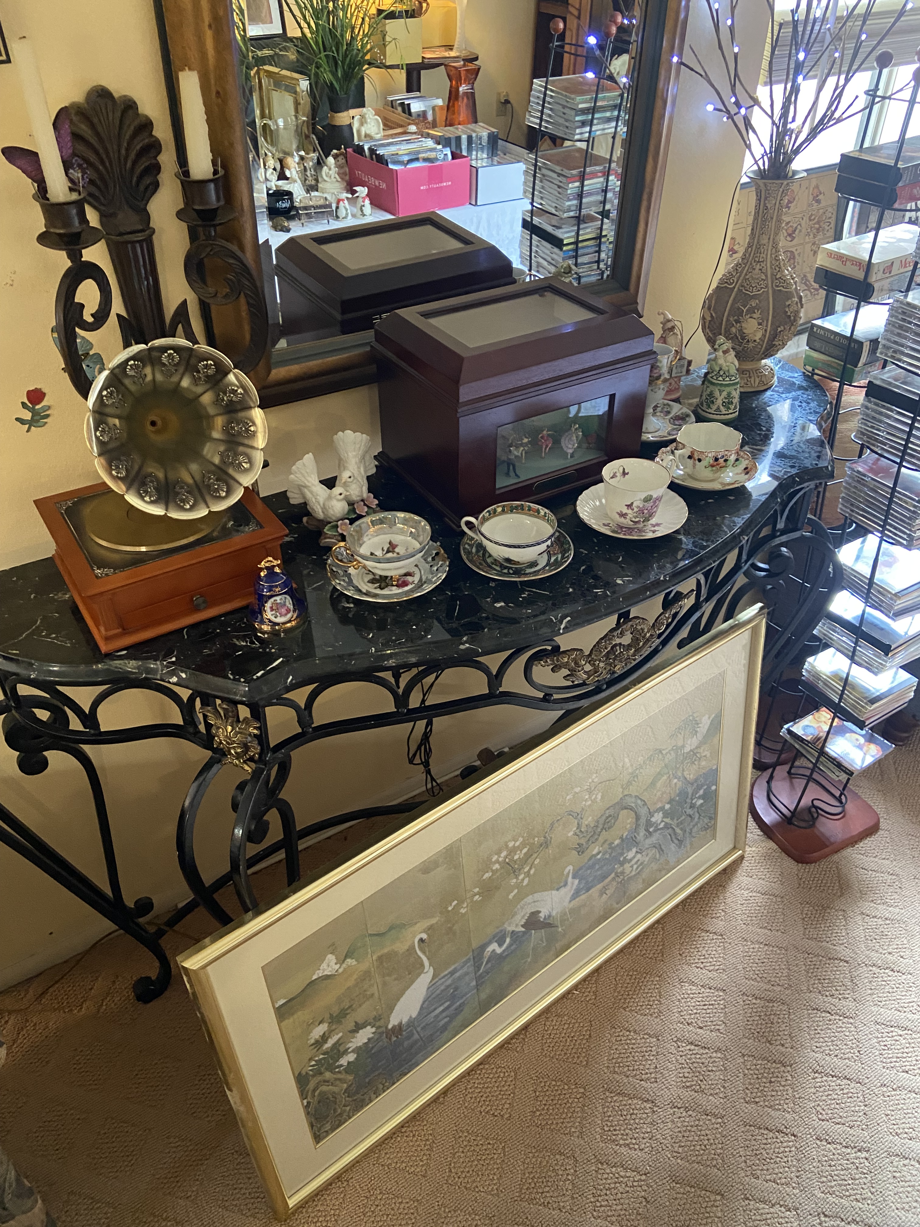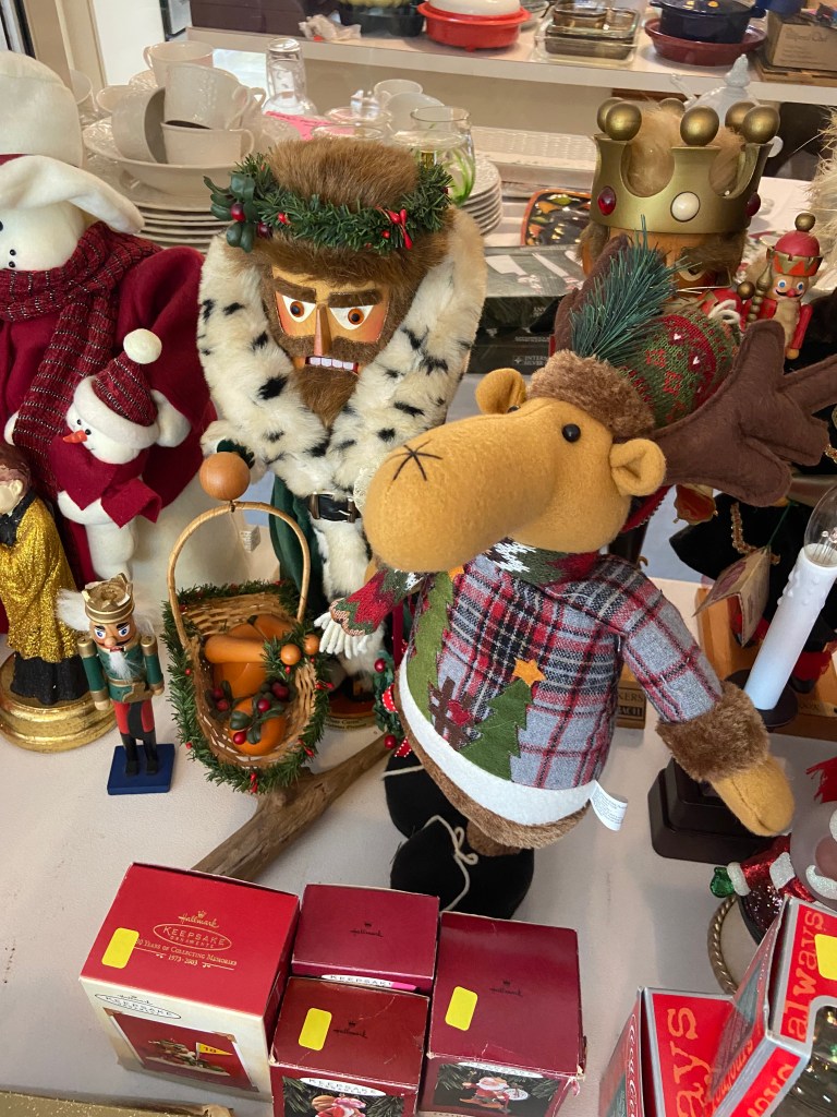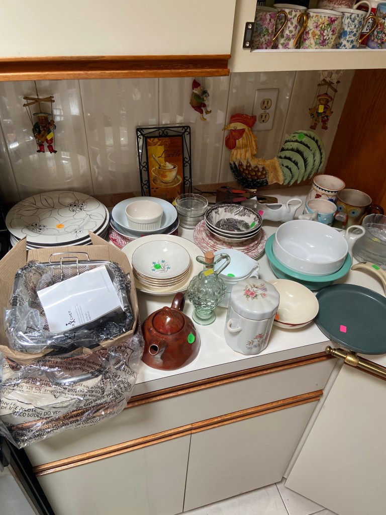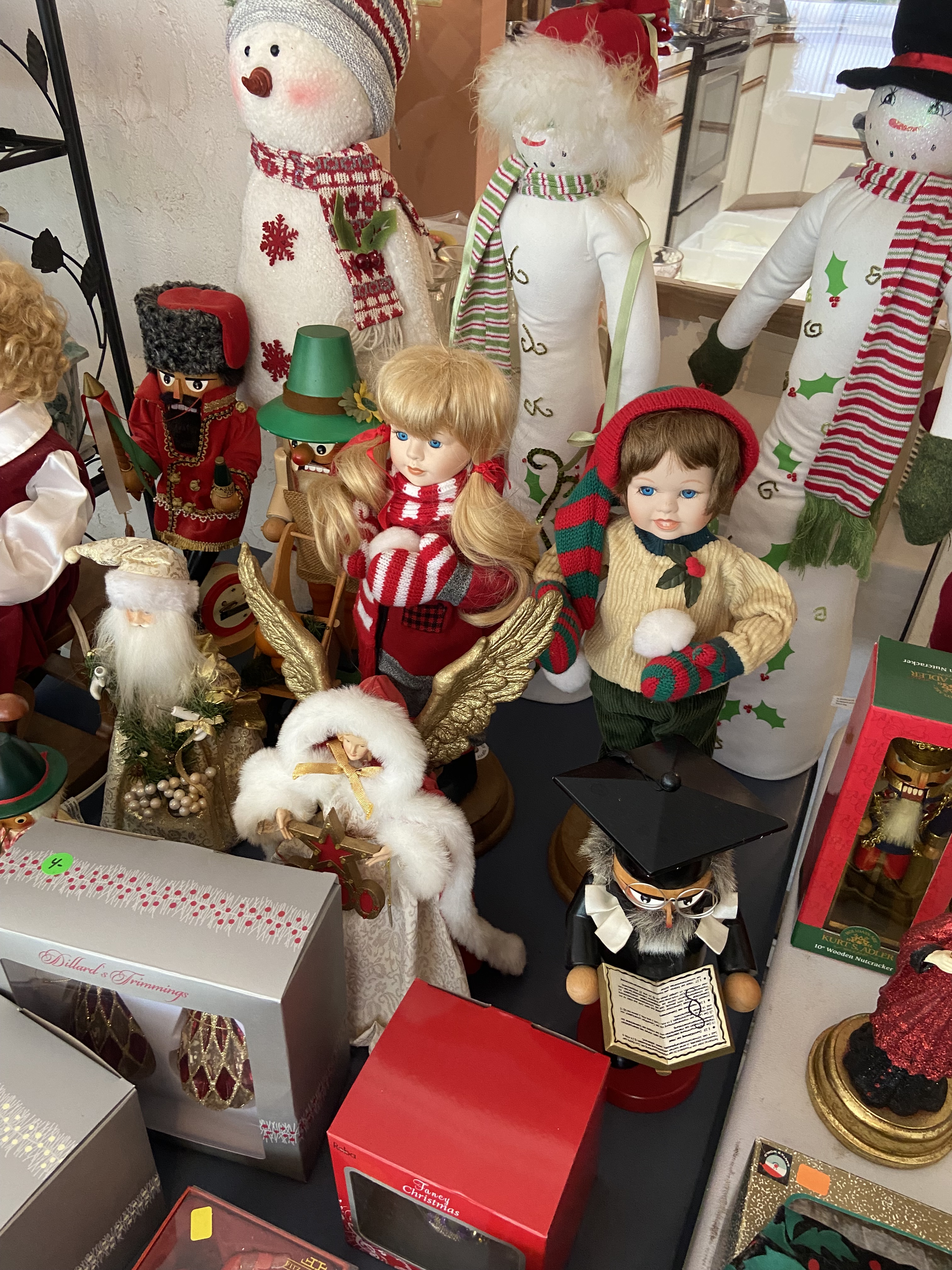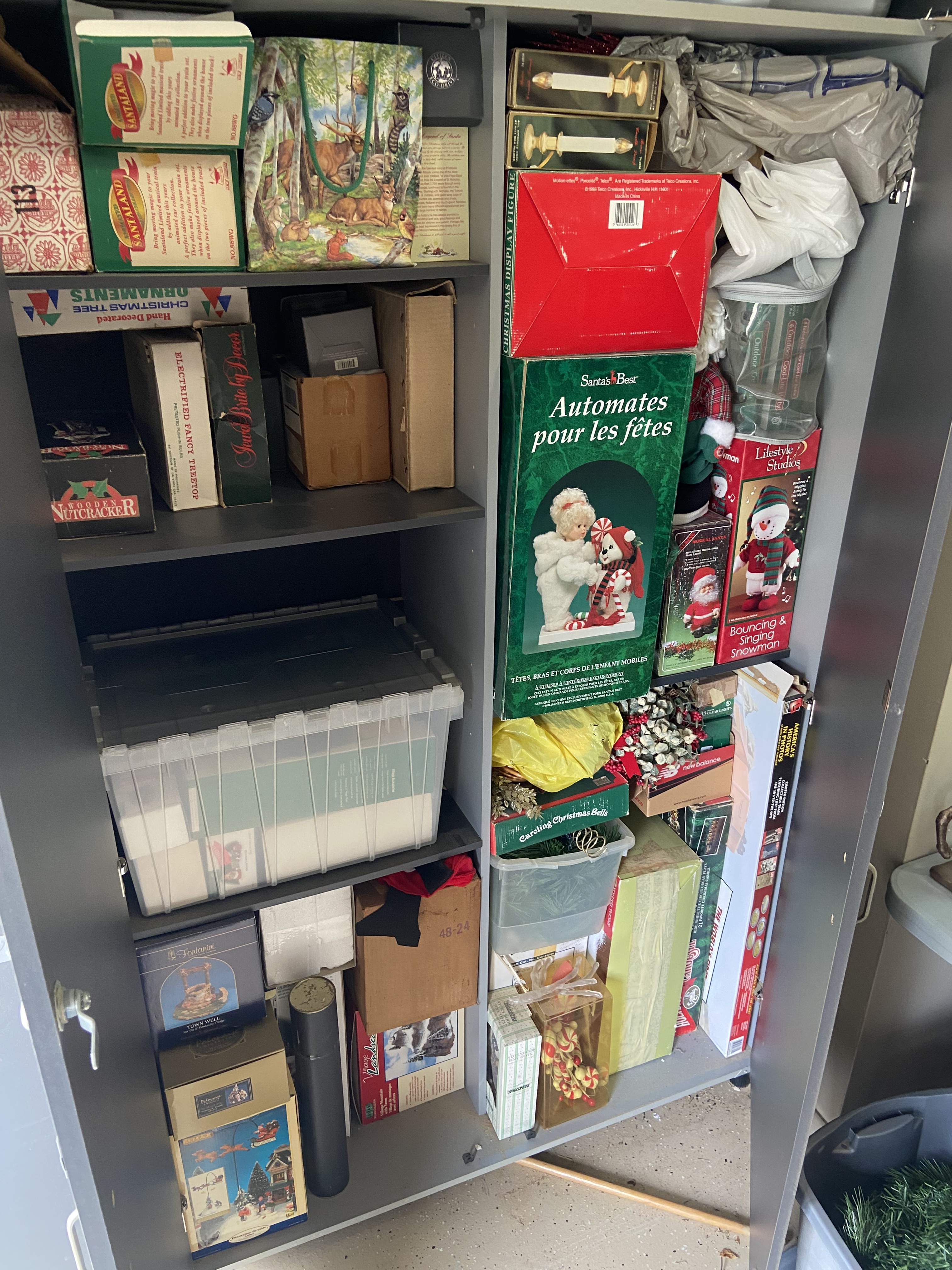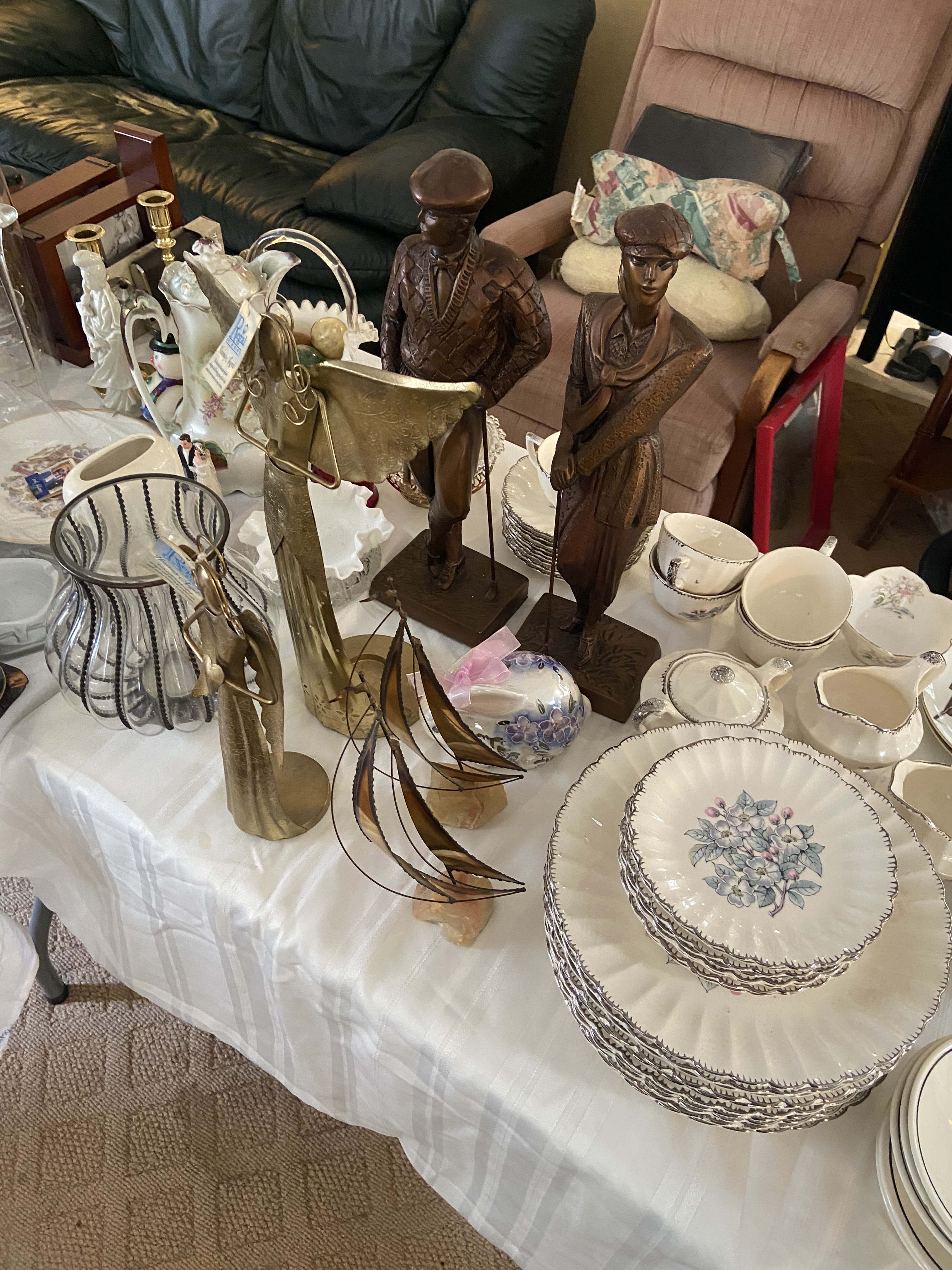 We have Burlington house hutch, marble top buffet, Vintage Collectibles, dining room table with four chairs, Hall tree, Steinbach Nutcracker from Germany, vintage hallway tables, art deco couch, decorator pieces, crystal, large fountain, mid-century armchairs, recliners, three stacking music box tables from Italy, Venus de Milo sculpture, pedestal, mid-century accent tables, curio, model ships, drop leaf dining room, table, and four chairs, marble top sofa table, artwork, CDs, VHS‘s, DVDs, albums, 78s, 45s and cassettes, 50 inch RCA Roku TV, stereo with turntable and cassette player, vintage oriental wooden birdcage, lamps, vases, green sofa, vintage pictures, sculptures, vacuums, room divider, bar area, kitchen, pampered chef, power juicer, Mikasa English Countryside dishes and serving set, vintage Hazel Aras hand painted glass set, glassware, toaster oven, knives and utensils, pots and pans, cookware, serving dishes, roosters, salt and pepper shakers, cups and dishes, canister sets, FA Pawla art Santa Barbara, we have a Christmas wonderland, Fontanini nativity set, department 56, village pieces, ornaments, Santa Claus figures, yard art, Christmas lights, dual patio glider, outdoor chairs, stressless recliner, patio set, storage bins, outdoor wall, art, outdoor cabinets and shelves, Thomasville bedroom set with dresser, high boy, nightstands and headboard, Butler writing desk, linens, high boy dresser, lingerie chest, jewelry boxes, vintage box phone, dolls, stuffed animals, throw pillows, OT fit briefs, shoes, hats, vintage hats, purses, bathroom items, early American dressers, high boy and nightstands, lamps, train sets, Viking Husqvarna sewing machine, bookcases, books, vintage and old books, old sheet music, vintage magazines, cameras, 35 mm cameras, digital cameras, vintage, Disney World, vintage camera accessories, shoe racks, we have hairdressers room, a large number of hairdresser supplies, hair dryer, hairdresser chair, cleaning supplies, art items, garage, three large Coleman storage chess, large Christmas tree, tennis rackets, tools, and much much more.