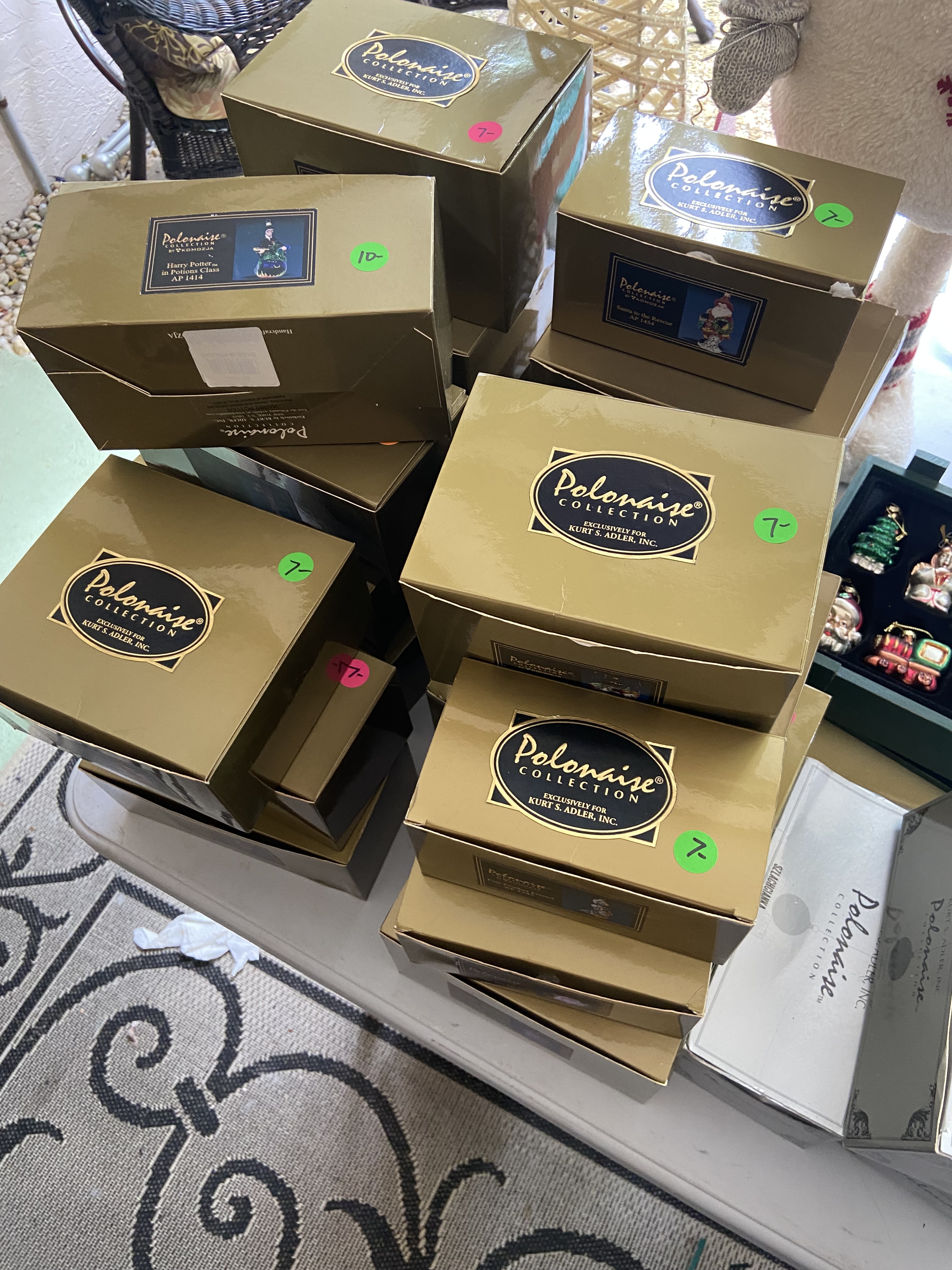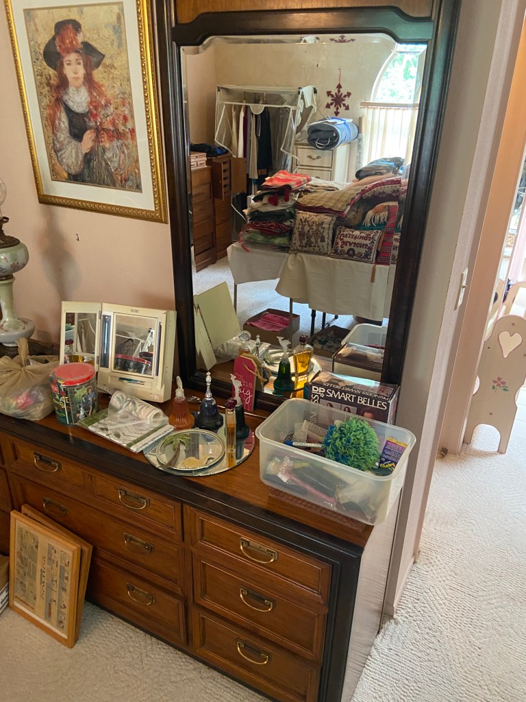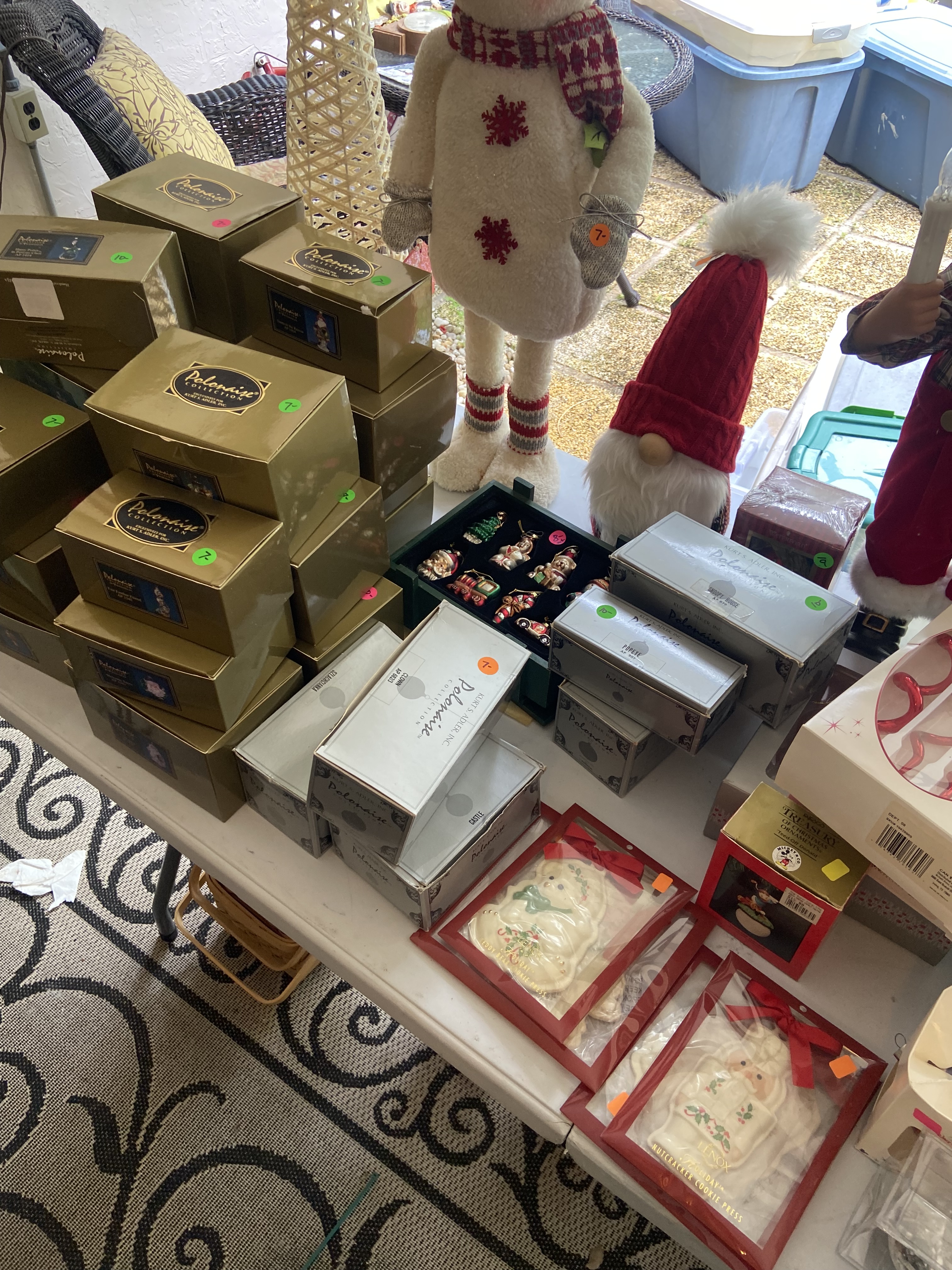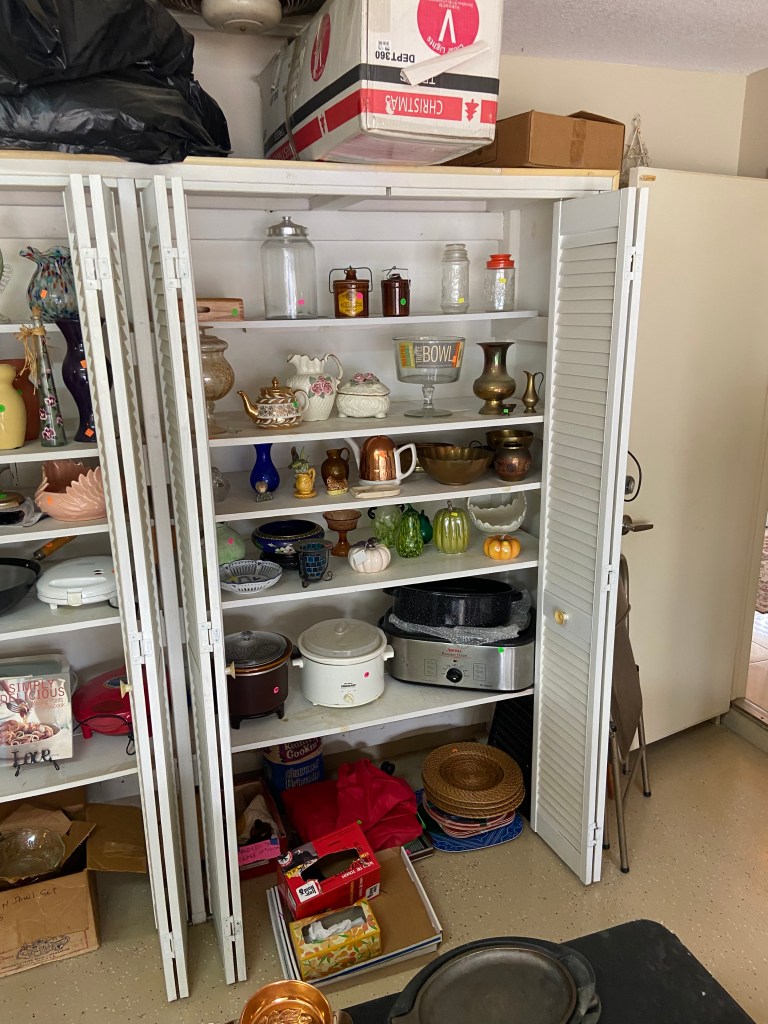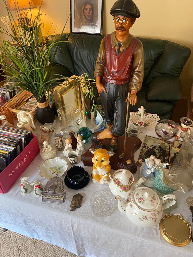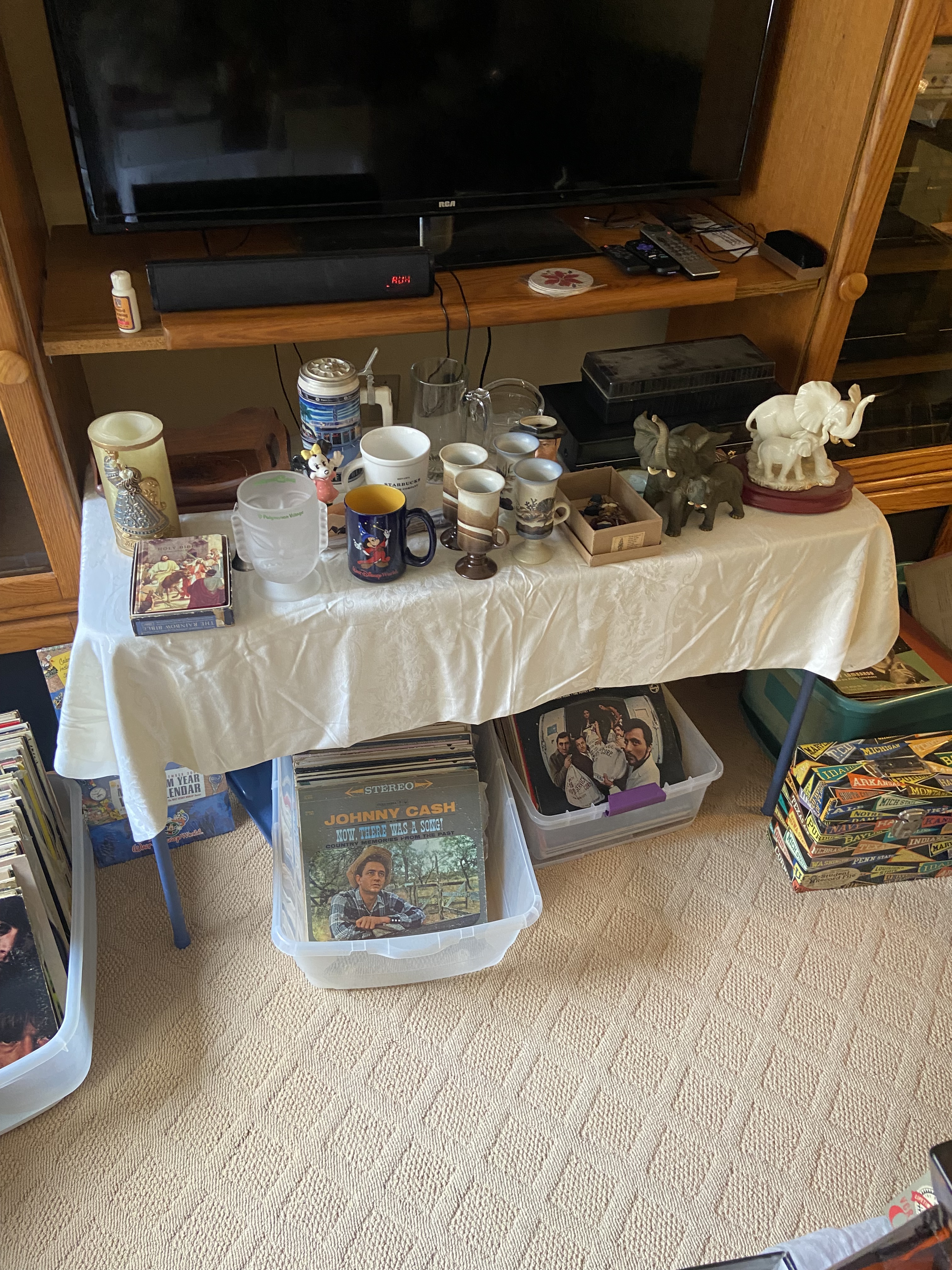 We have Burlington house hutch, marble top buffet, Vintage Collectibles, dining room table with four chairs, Hall tree, Steinbach Nutcracker from Germany, vintage hallway tables, art deco couch, decorator pieces, crystal, large fountain, mid-century armchairs, recliners, three stacking music box tables from Italy, Venus de Milo sculpture, pedestal, mid-century accent tables, curio, model ships, drop leaf dining room, table, and four chairs, marble top sofa table, artwork, CDs, VHS‘s, DVDs, albums, 78s, 45s and cassettes, 50 inch RCA Roku TV, stereo with turntable and cassette player, vintage oriental wooden birdcage, lamps, vases, green sofa, vintage pictures, sculptures, vacuums, room divider, bar area, kitchen, pampered chef, power juicer, Mikasa English Countryside dishes and serving set, vintage Hazel Aras hand painted glass set, glassware, toaster oven, knives and utensils, pots and pans, cookware, serving dishes, roosters, salt and pepper shakers, cups and dishes, canister sets, FA Pawla art Santa Barbara, we have a Christmas wonderland, Fontanini nativity set, department 56, village pieces, ornaments, Santa Claus figures, yard art, Christmas lights, dual patio glider, outdoor chairs, stressless recliner, patio set, storage bins, outdoor wall, art, outdoor cabinets and shelves, Thomasville bedroom set with dresser, high boy, nightstands and headboard, Butler writing desk, linens, high boy dresser, lingerie chest, jewelry boxes, vintage box phone, dolls, stuffed animals, throw pillows, OT fit briefs, shoes, hats, vintage hats, purses, bathroom items, early American dressers, high boy and nightstands, lamps, train sets, Viking Husqvarna sewing machine, bookcases, books, vintage and old books, old sheet music, vintage magazines, cameras, 35 mm cameras, digital cameras, vintage, Disney World, vintage camera accessories, shoe racks, we have hairdressers room, a large number of hairdresser supplies, hair dryer, hairdresser chair, cleaning supplies, art items, garage, three large Coleman storage chess, large Christmas tree, tennis rackets, tools, and much much more.