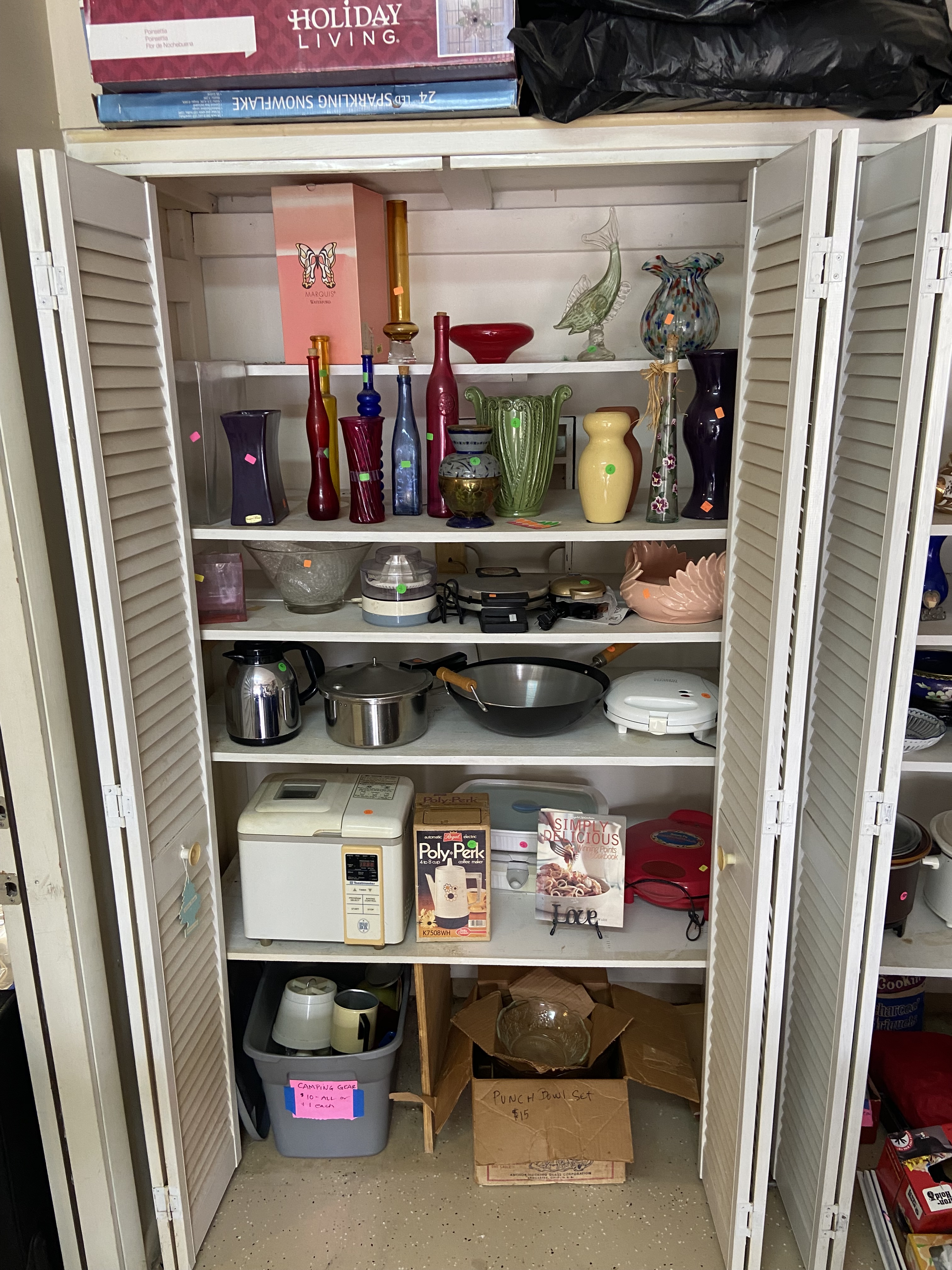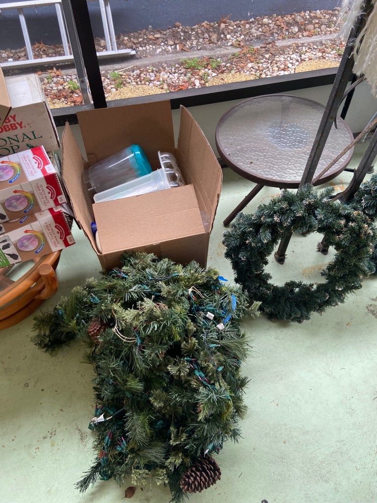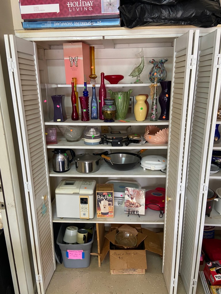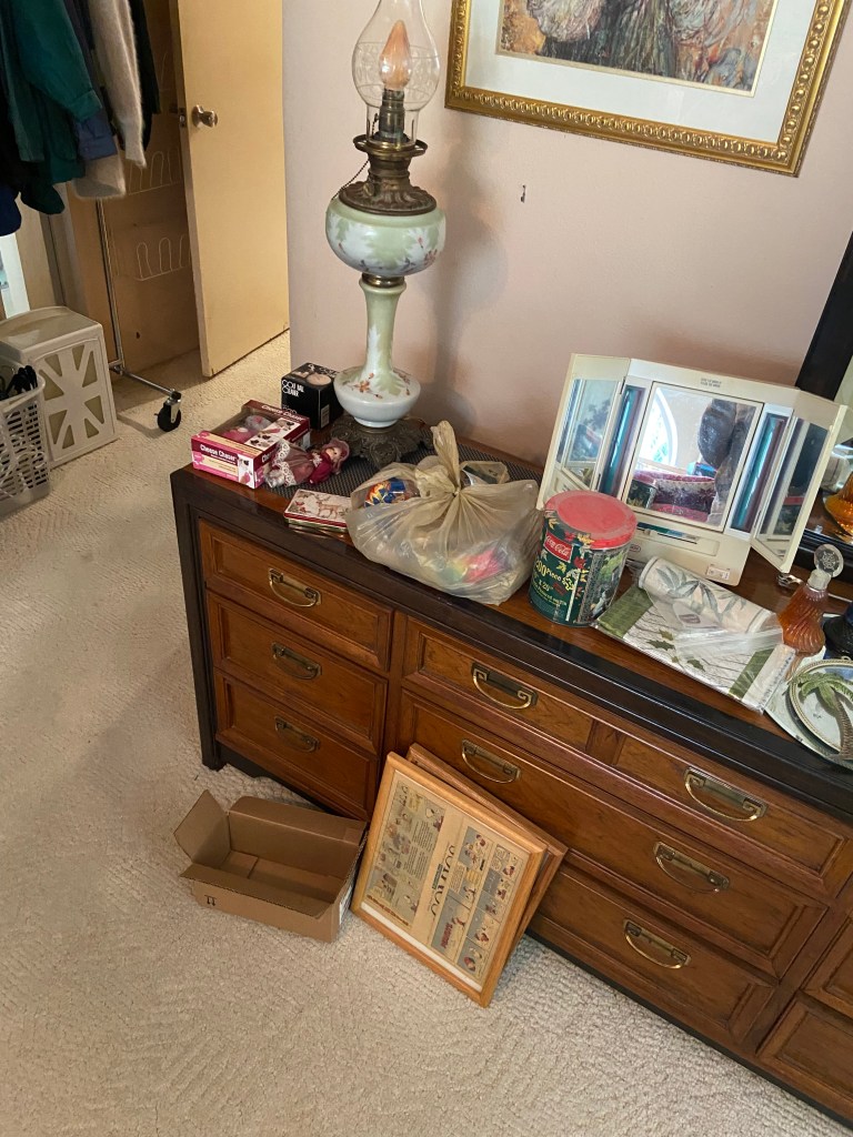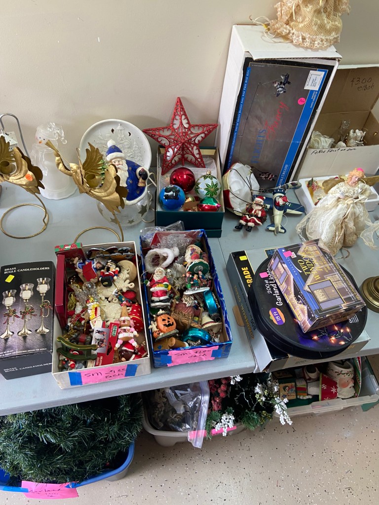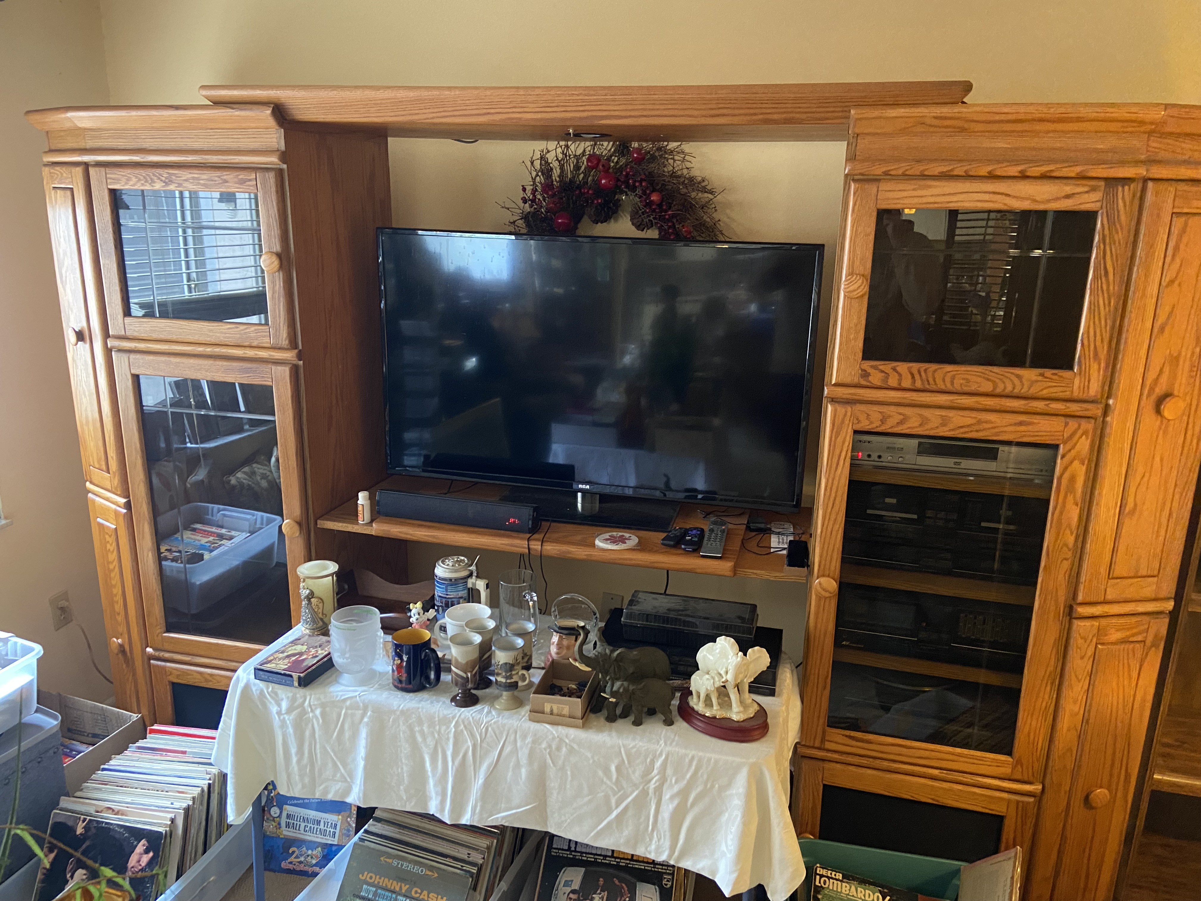 We have Burlington house hutch, marble top buffet, Vintage Collectibles, dining room table with four chairs, Hall tree, Steinbach Nutcracker from Germany, vintage hallway tables, art deco couch, decorator pieces, crystal, large fountain, mid-century armchairs, recliners, three stacking music box tables from Italy, Venus de Milo sculpture, pedestal, mid-century accent tables, curio, model ships, drop leaf dining room, table, and four chairs, marble top sofa table, artwork, CDs, VHS‘s, DVDs, albums, 78s, 45s and cassettes, 50 inch RCA Roku TV, stereo with turntable and cassette player, vintage oriental wooden birdcage, lamps, vases, green sofa, vintage pictures, sculptures, vacuums, room divider, bar area, kitchen, pampered chef, power juicer, Mikasa English Countryside dishes and serving set, vintage Hazel Aras hand painted glass set, glassware, toaster oven, knives and utensils, pots and pans, cookware, serving dishes, roosters, salt and pepper shakers, cups and dishes, canister sets, FA Pawla art Santa Barbara, we have a Christmas wonderland, Fontanini nativity set, department 56, village pieces, ornaments, Santa Claus figures, yard art, Christmas lights, dual patio glider, outdoor chairs, stressless recliner, patio set, storage bins, outdoor wall, art, outdoor cabinets and shelves, Thomasville bedroom set with dresser, high boy, nightstands and headboard, Butler writing desk, linens, high boy dresser, lingerie chest, jewelry boxes, vintage box phone, dolls, stuffed animals, throw pillows, OT fit briefs, shoes, hats, vintage hats, purses, bathroom items, early American dressers, high boy and nightstands, lamps, train sets, Viking Husqvarna sewing machine, bookcases, books, vintage and old books, old sheet music, vintage magazines, cameras, 35 mm cameras, digital cameras, vintage, Disney World, vintage camera accessories, shoe racks, we have hairdressers room, a large number of hairdresser supplies, hair dryer, hairdresser chair, cleaning supplies, art items, garage, three large Coleman storage chess, large Christmas tree, tennis rackets, tools, and much much more.