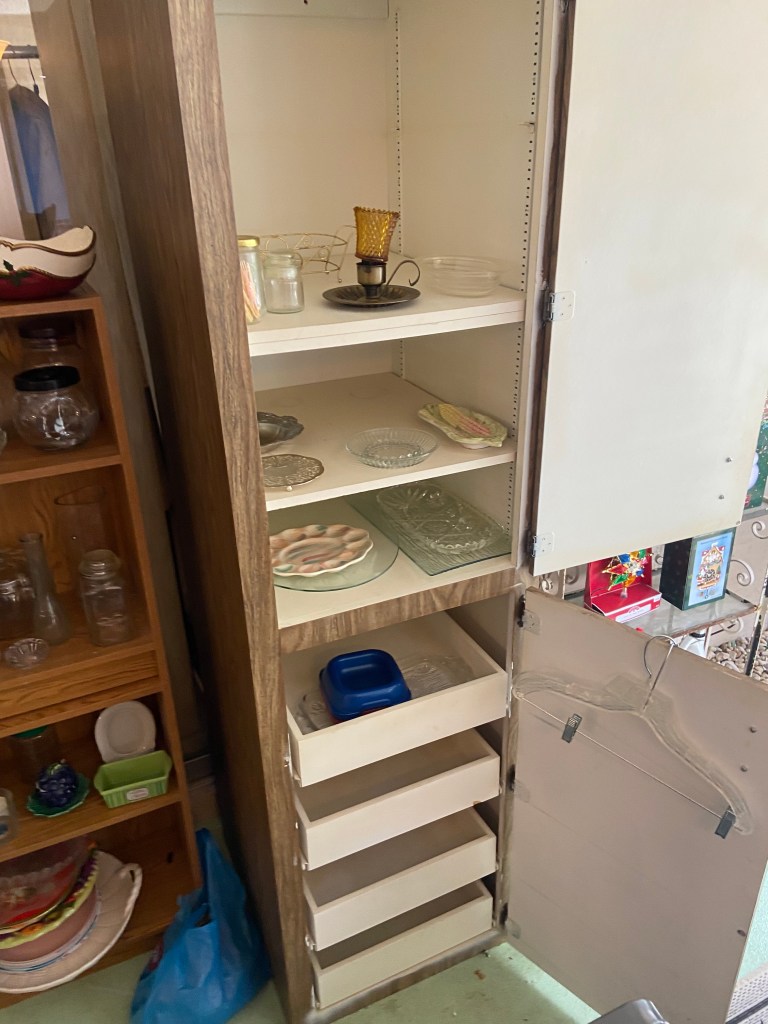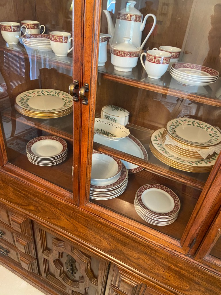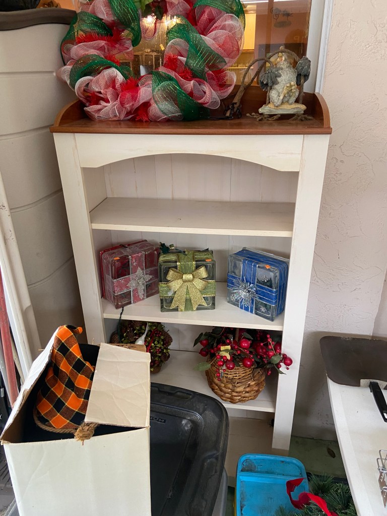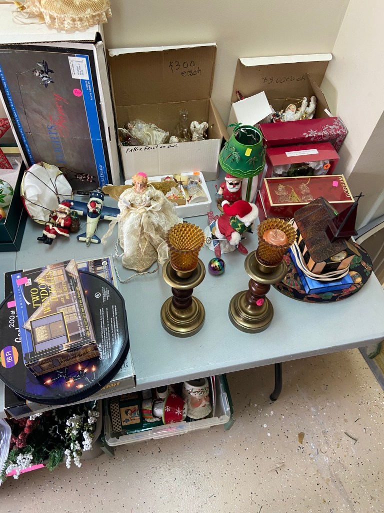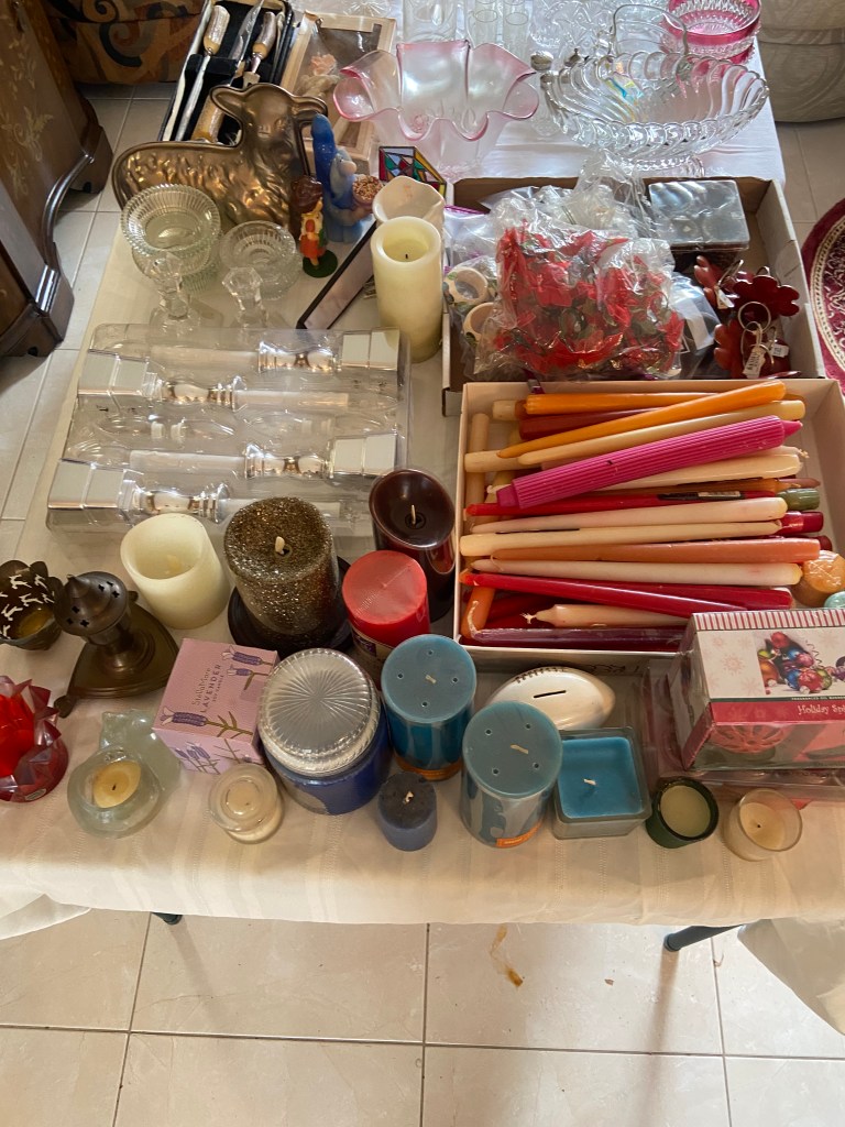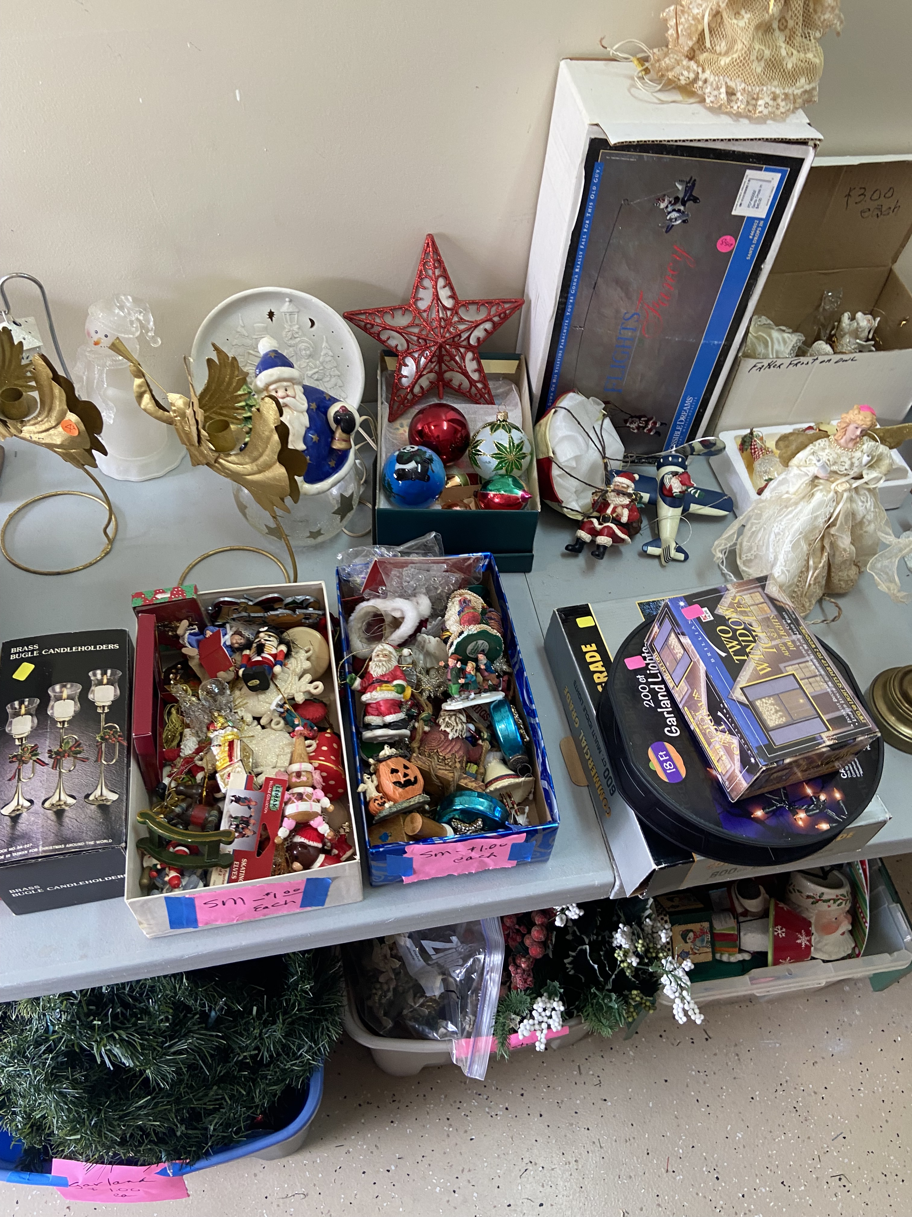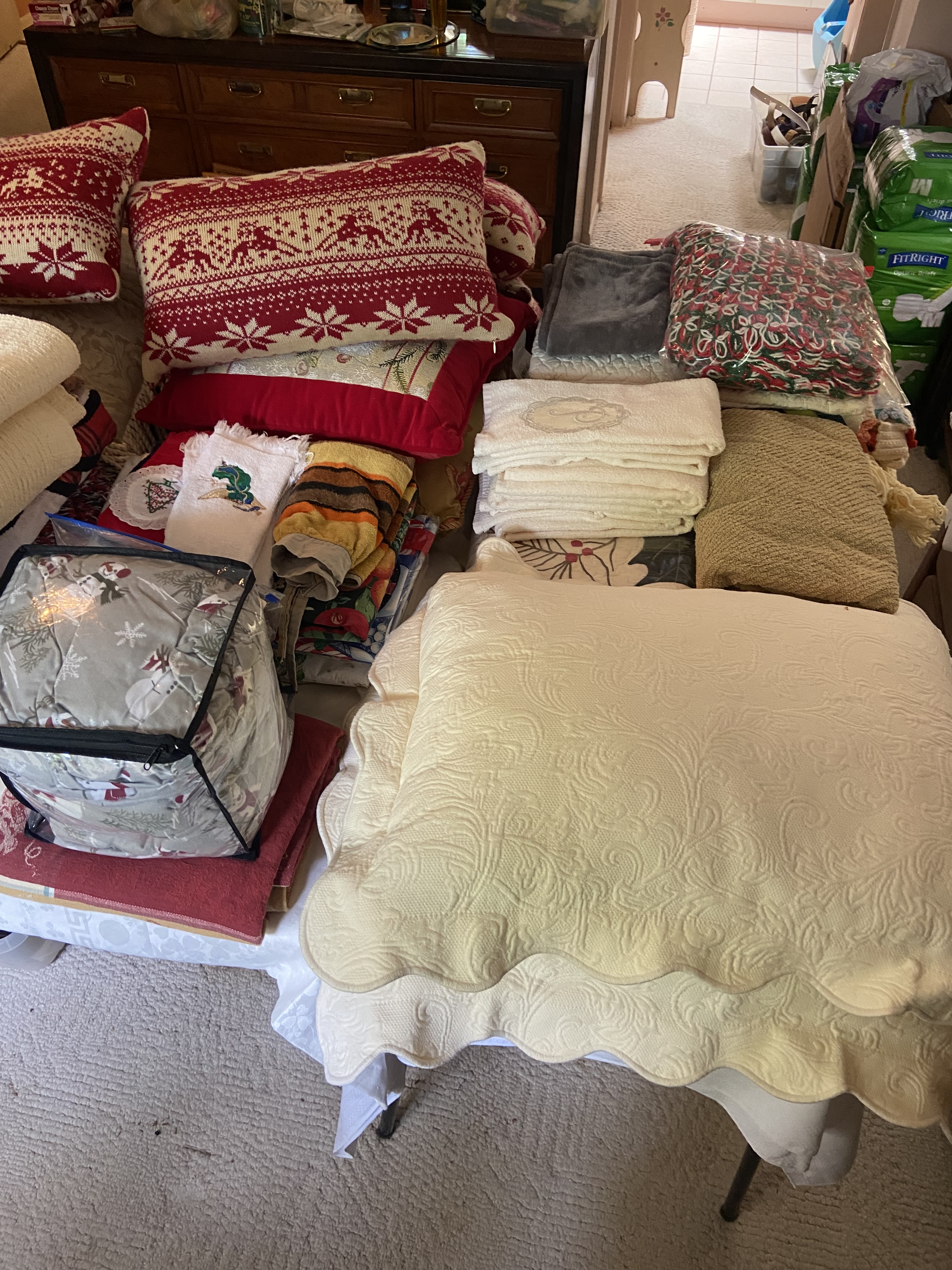 We have Burlington house hutch, marble top buffet, Vintage Collectibles, dining room table with four chairs, Hall tree, Steinbach Nutcracker from Germany, vintage hallway tables, art deco couch, decorator pieces, crystal, large fountain, mid-century armchairs, recliners, three stacking music box tables from Italy, Venus de Milo sculpture, pedestal, mid-century accent tables, curio, model ships, drop leaf dining room, table, and four chairs, marble top sofa table, artwork, CDs, VHS‘s, DVDs, albums, 78s, 45s and cassettes, 50 inch RCA Roku TV, stereo with turntable and cassette player, vintage oriental wooden birdcage, lamps, vases, green sofa, vintage pictures, sculptures, vacuums, room divider, bar area, kitchen, pampered chef, power juicer, Mikasa English Countryside dishes and serving set, vintage Hazel Aras hand painted glass set, glassware, toaster oven, knives and utensils, pots and pans, cookware, serving dishes, roosters, salt and pepper shakers, cups and dishes, canister sets, FA Pawla art Santa Barbara, we have a Christmas wonderland, Fontanini nativity set, department 56, village pieces, ornaments, Santa Claus figures, yard art, Christmas lights, dual patio glider, outdoor chairs, stressless recliner, patio set, storage bins, outdoor wall, art, outdoor cabinets and shelves, Thomasville bedroom set with dresser, high boy, nightstands and headboard, Butler writing desk, linens, high boy dresser, lingerie chest, jewelry boxes, vintage box phone, dolls, stuffed animals, throw pillows, OT fit briefs, shoes, hats, vintage hats, purses, bathroom items, early American dressers, high boy and nightstands, lamps, train sets, Viking Husqvarna sewing machine, bookcases, books, vintage and old books, old sheet music, vintage magazines, cameras, 35 mm cameras, digital cameras, vintage, Disney World, vintage camera accessories, shoe racks, we have hairdressers room, a large number of hairdresser supplies, hair dryer, hairdresser chair, cleaning supplies, art items, garage, three large Coleman storage chess, large Christmas tree, tennis rackets, tools, and much much more.