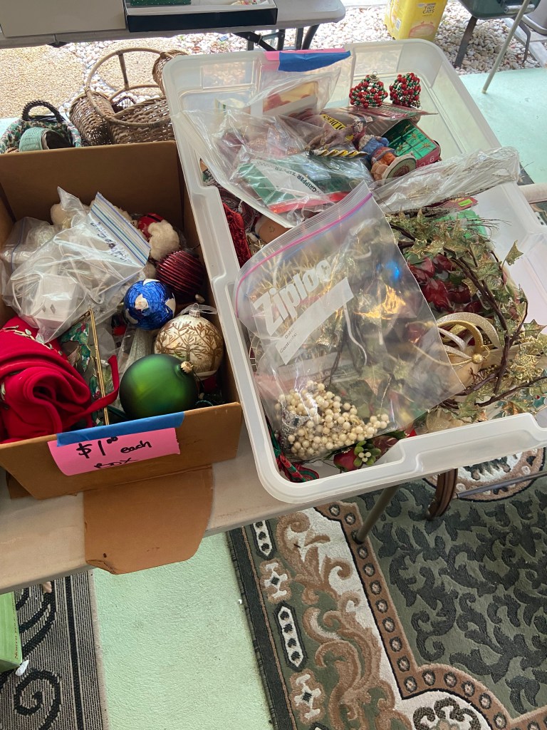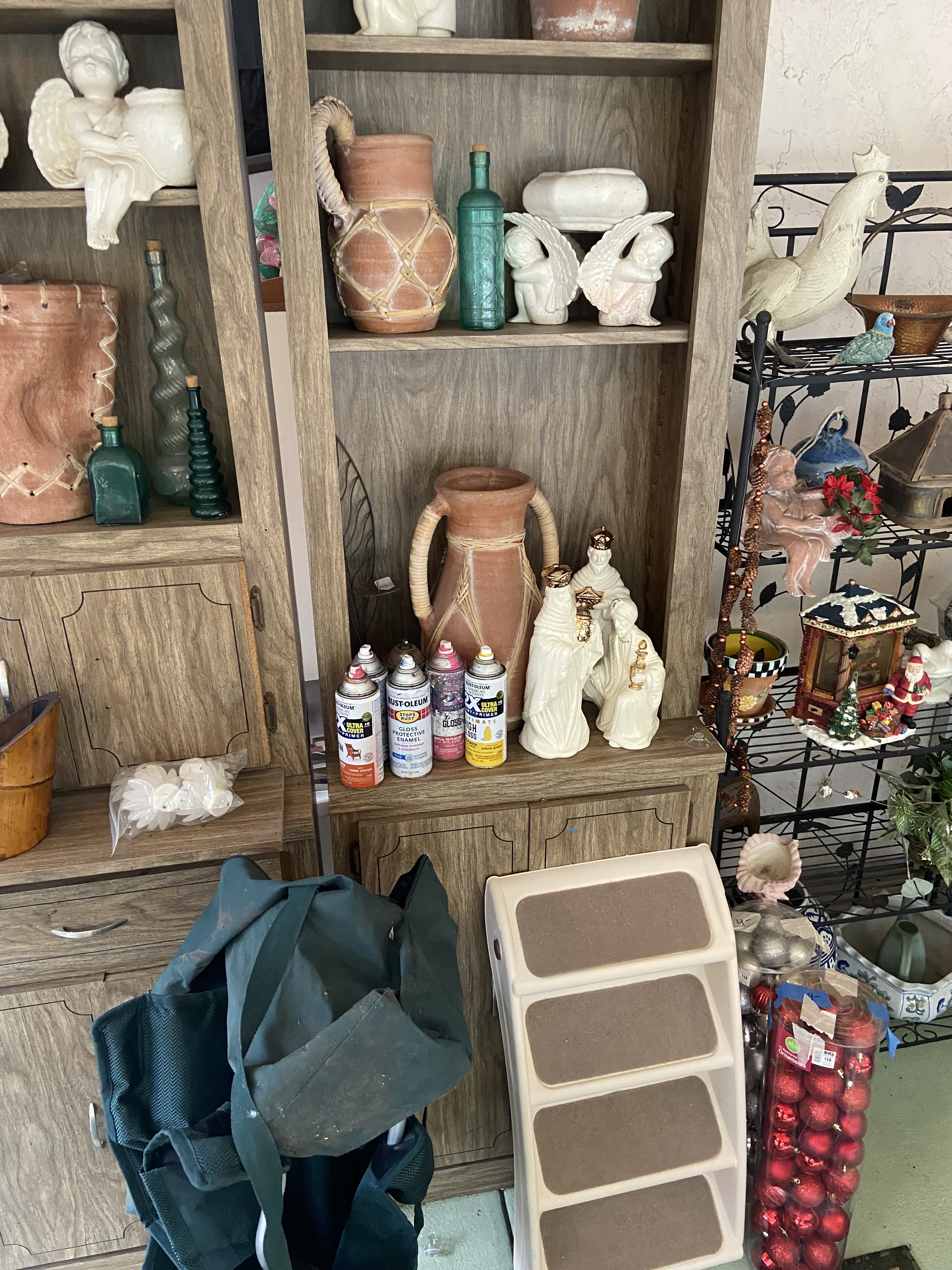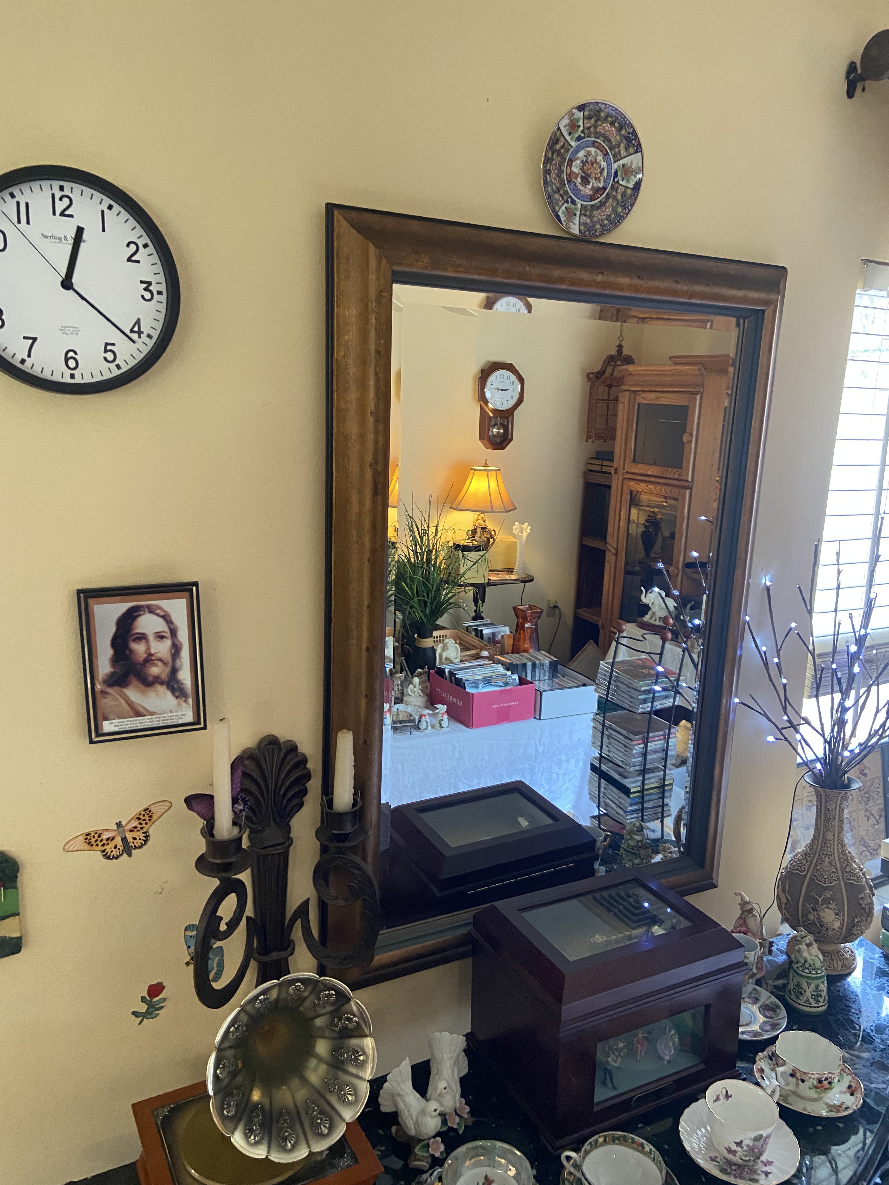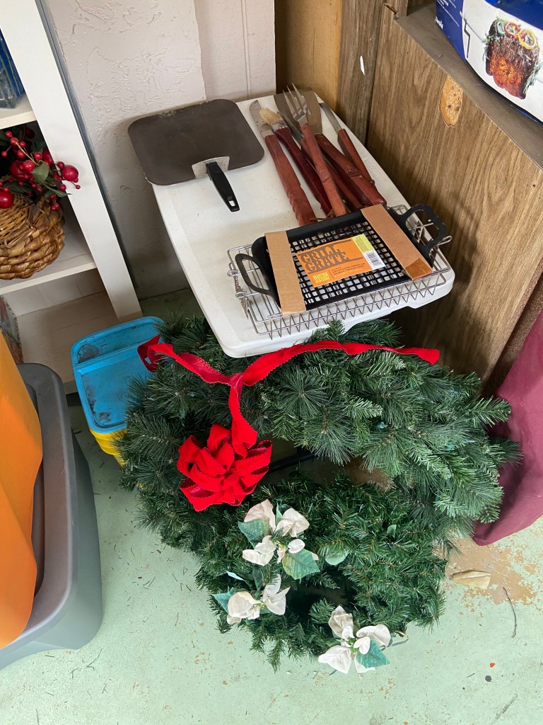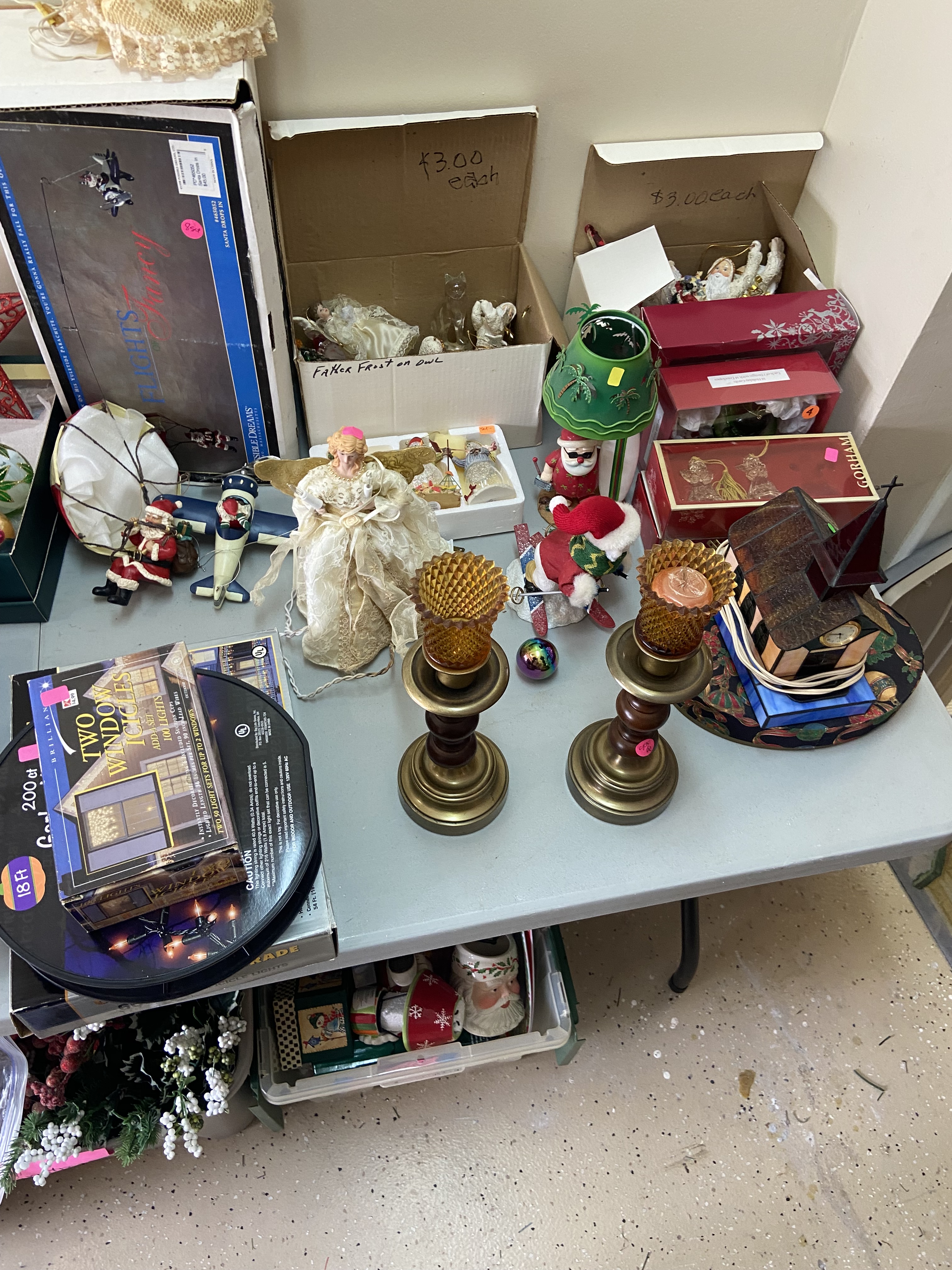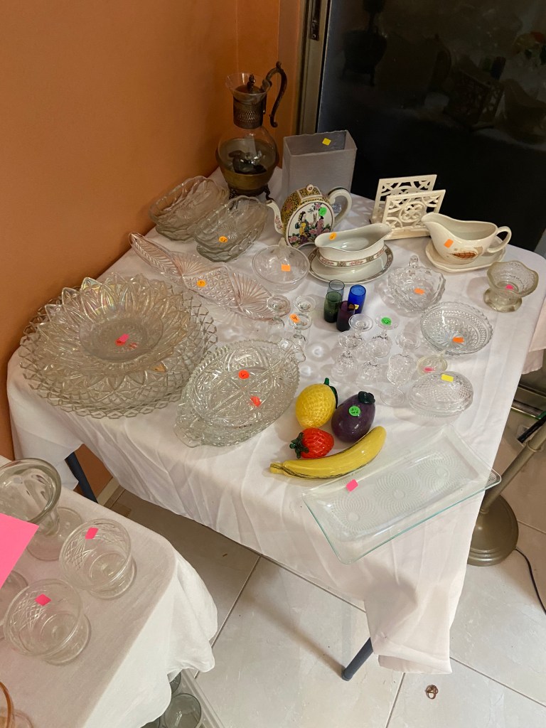 We have Burlington house hutch, marble top buffet, Vintage Collectibles, dining room table with four chairs, Hall tree, Steinbach Nutcracker from Germany, vintage hallway tables, art deco couch, decorator pieces, crystal, large fountain, mid-century armchairs, recliners, three stacking music box tables from Italy, Venus de Milo sculpture, pedestal, mid-century accent tables, curio, model ships, drop leaf dining room, table, and four chairs, marble top sofa table, artwork, CDs, VHS‘s, DVDs, albums, 78s, 45s and cassettes, 50 inch RCA Roku TV, stereo with turntable and cassette player, vintage oriental wooden birdcage, lamps, vases, green sofa, vintage pictures, sculptures, vacuums, room divider, bar area, kitchen, pampered chef, power juicer, Mikasa English Countryside dishes and serving set, vintage Hazel Aras hand painted glass set, glassware, toaster oven, knives and utensils, pots and pans, cookware, serving dishes, roosters, salt and pepper shakers, cups and dishes, canister sets, FA Pawla art Santa Barbara, we have a Christmas wonderland, Fontanini nativity set, department 56, village pieces, ornaments, Santa Claus figures, yard art, Christmas lights, dual patio glider, outdoor chairs, stressless recliner, patio set, storage bins, outdoor wall, art, outdoor cabinets and shelves, Thomasville bedroom set with dresser, high boy, nightstands and headboard, Butler writing desk, linens, high boy dresser, lingerie chest, jewelry boxes, vintage box phone, dolls, stuffed animals, throw pillows, OT fit briefs, shoes, hats, vintage hats, purses, bathroom items, early American dressers, high boy and nightstands, lamps, train sets, Viking Husqvarna sewing machine, bookcases, books, vintage and old books, old sheet music, vintage magazines, cameras, 35 mm cameras, digital cameras, vintage, Disney World, vintage camera accessories, shoe racks, we have hairdressers room, a large number of hairdresser supplies, hair dryer, hairdresser chair, cleaning supplies, art items, garage, three large Coleman storage chess, large Christmas tree, tennis rackets, tools, and much much more.