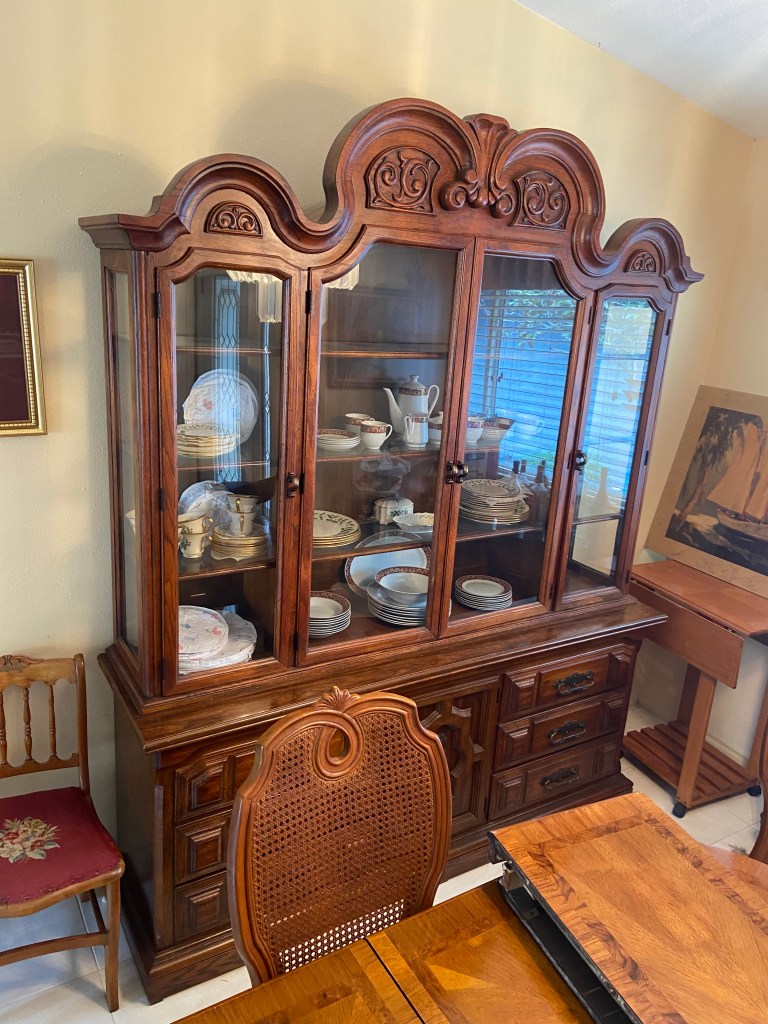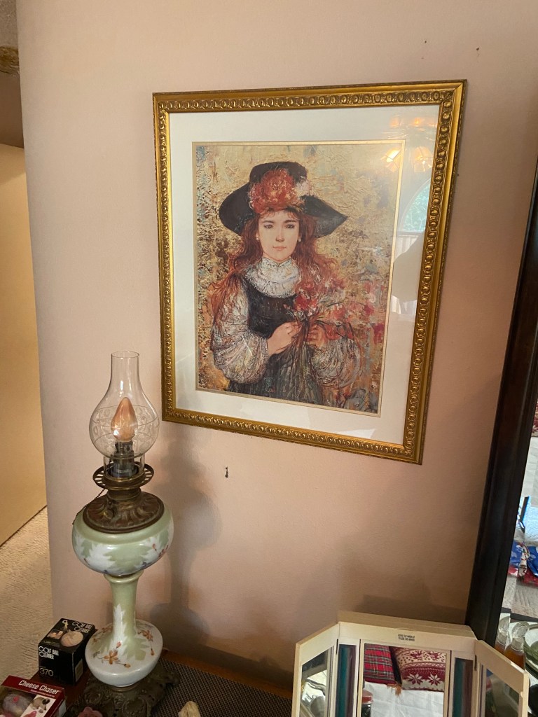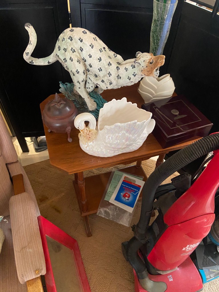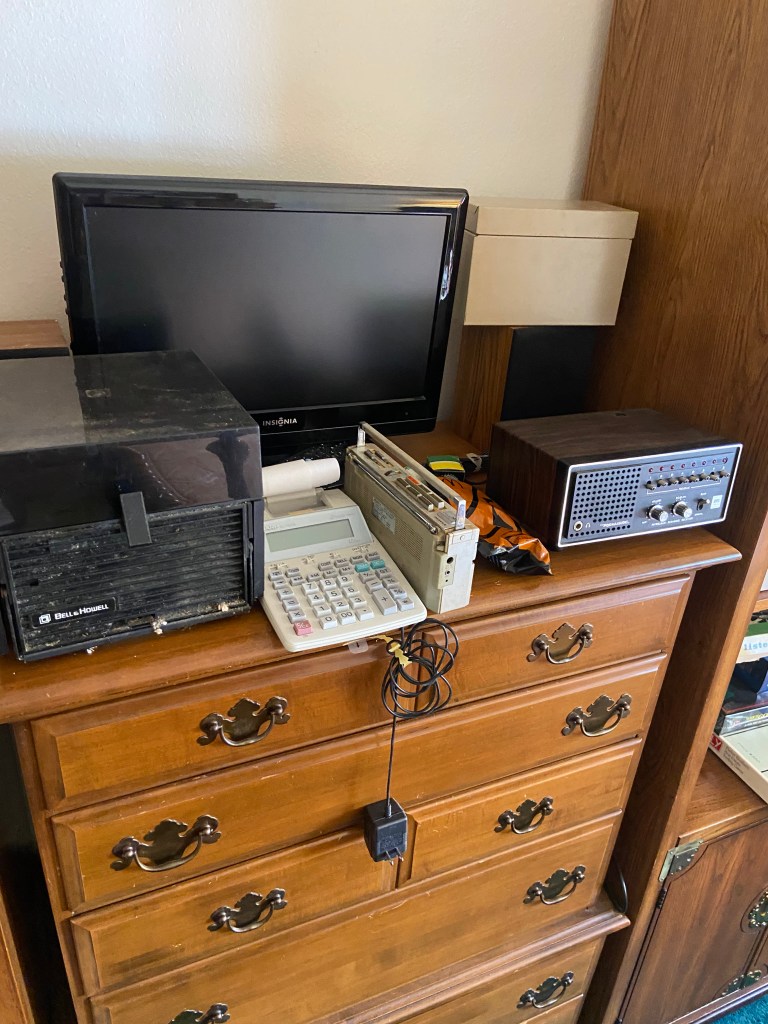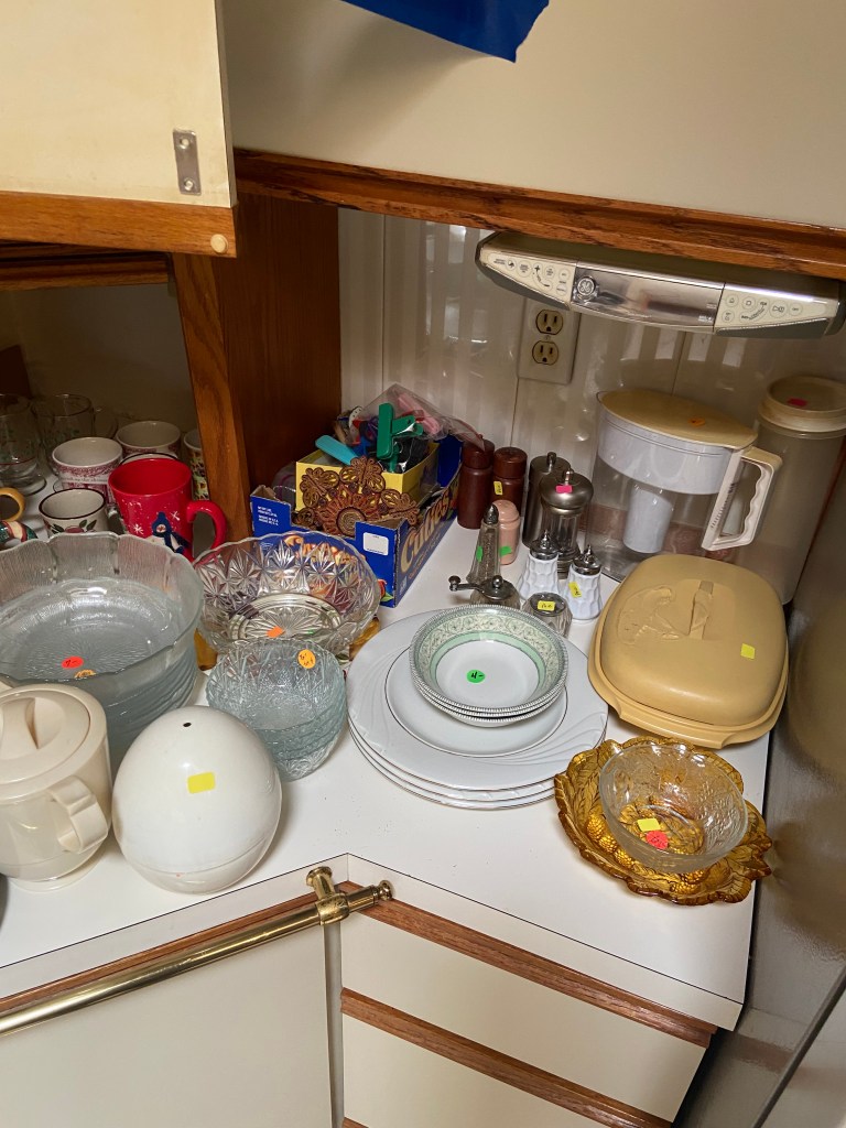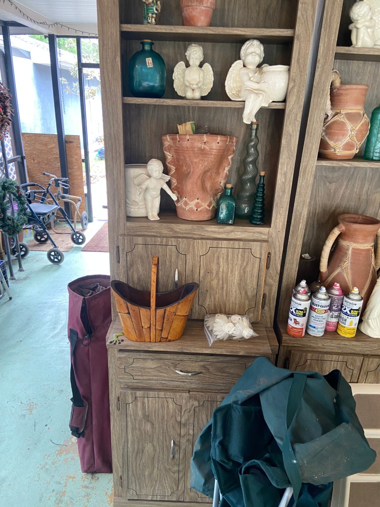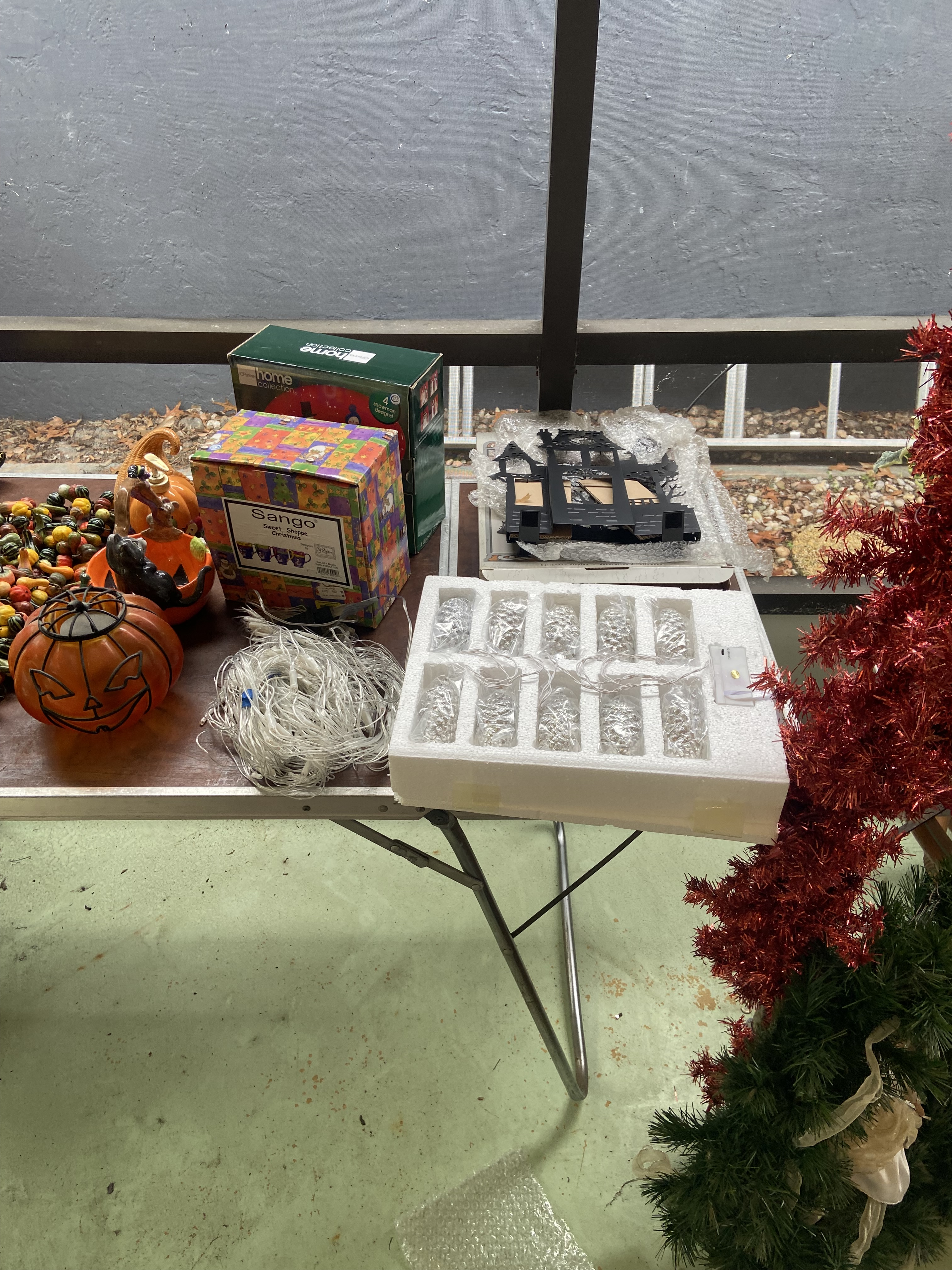 We have Burlington house hutch, marble top buffet, Vintage Collectibles, dining room table with four chairs, Hall tree, Steinbach Nutcracker from Germany, vintage hallway tables, art deco couch, decorator pieces, crystal, large fountain, mid-century armchairs, recliners, three stacking music box tables from Italy, Venus de Milo sculpture, pedestal, mid-century accent tables, curio, model ships, drop leaf dining room, table, and four chairs, marble top sofa table, artwork, CDs, VHS‘s, DVDs, albums, 78s, 45s and cassettes, 50 inch RCA Roku TV, stereo with turntable and cassette player, vintage oriental wooden birdcage, lamps, vases, green sofa, vintage pictures, sculptures, vacuums, room divider, bar area, kitchen, pampered chef, power juicer, Mikasa English Countryside dishes and serving set, vintage Hazel Aras hand painted glass set, glassware, toaster oven, knives and utensils, pots and pans, cookware, serving dishes, roosters, salt and pepper shakers, cups and dishes, canister sets, FA Pawla art Santa Barbara, we have a Christmas wonderland, Fontanini nativity set, department 56, village pieces, ornaments, Santa Claus figures, yard art, Christmas lights, dual patio glider, outdoor chairs, stressless recliner, patio set, storage bins, outdoor wall, art, outdoor cabinets and shelves, Thomasville bedroom set with dresser, high boy, nightstands and headboard, Butler writing desk, linens, high boy dresser, lingerie chest, jewelry boxes, vintage box phone, dolls, stuffed animals, throw pillows, OT fit briefs, shoes, hats, vintage hats, purses, bathroom items, early American dressers, high boy and nightstands, lamps, train sets, Viking Husqvarna sewing machine, bookcases, books, vintage and old books, old sheet music, vintage magazines, cameras, 35 mm cameras, digital cameras, vintage, Disney World, vintage camera accessories, shoe racks, we have hairdressers room, a large number of hairdresser supplies, hair dryer, hairdresser chair, cleaning supplies, art items, garage, three large Coleman storage chess, large Christmas tree, tennis rackets, tools, and much much more.