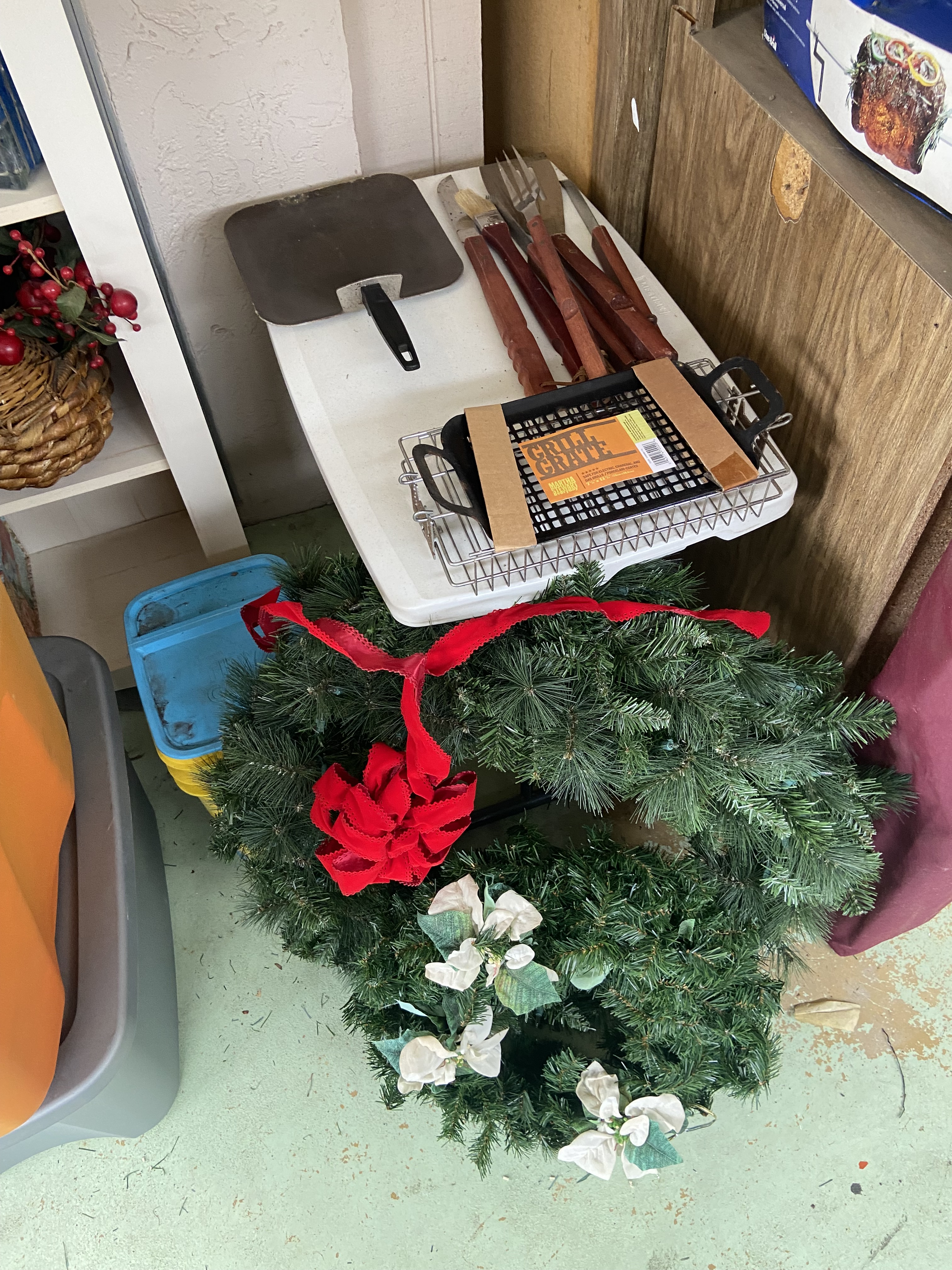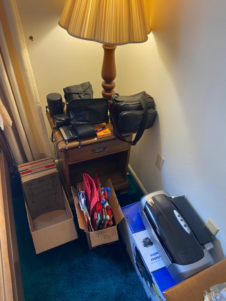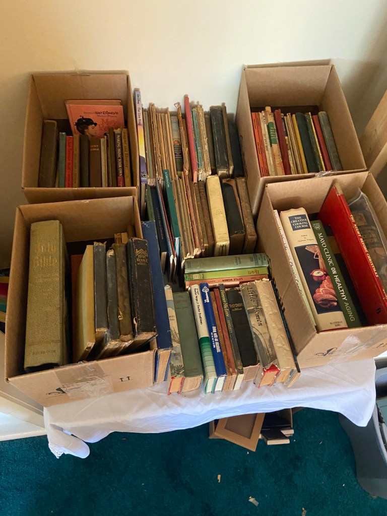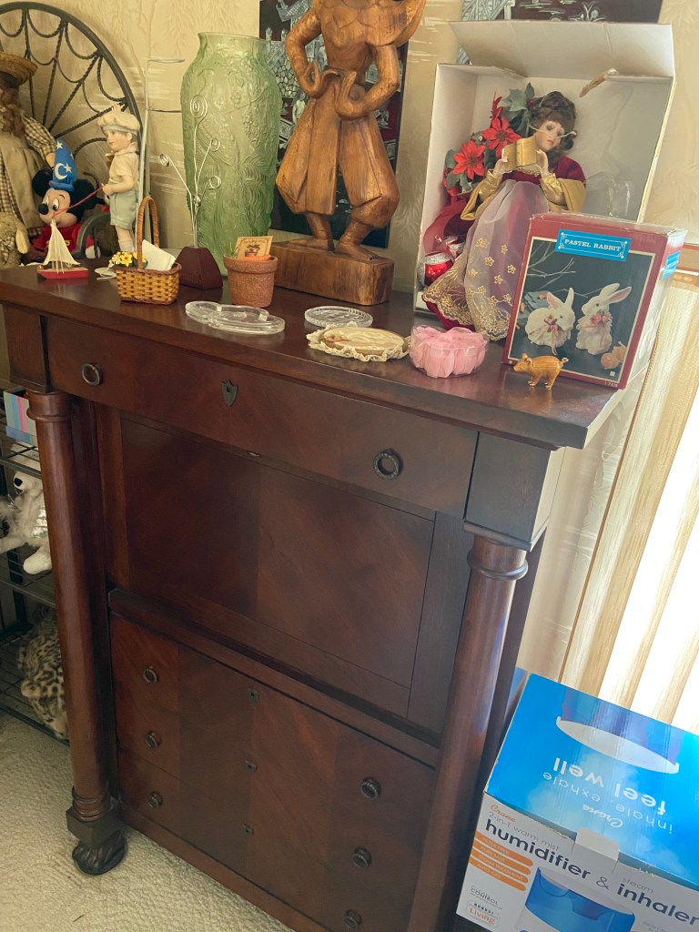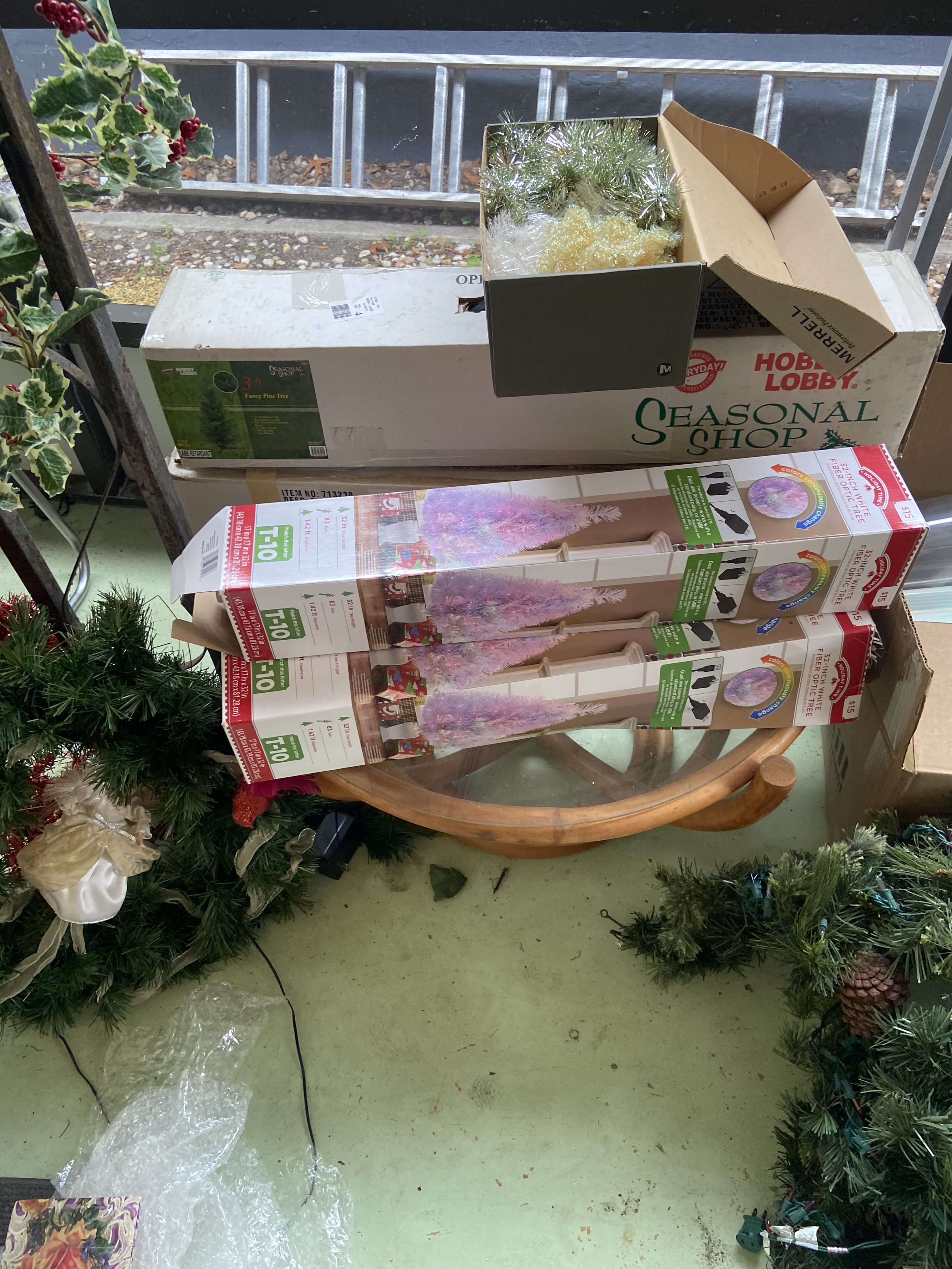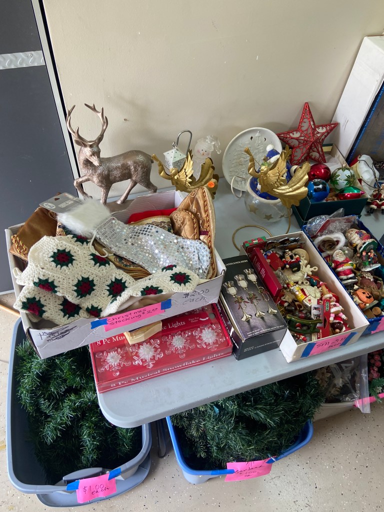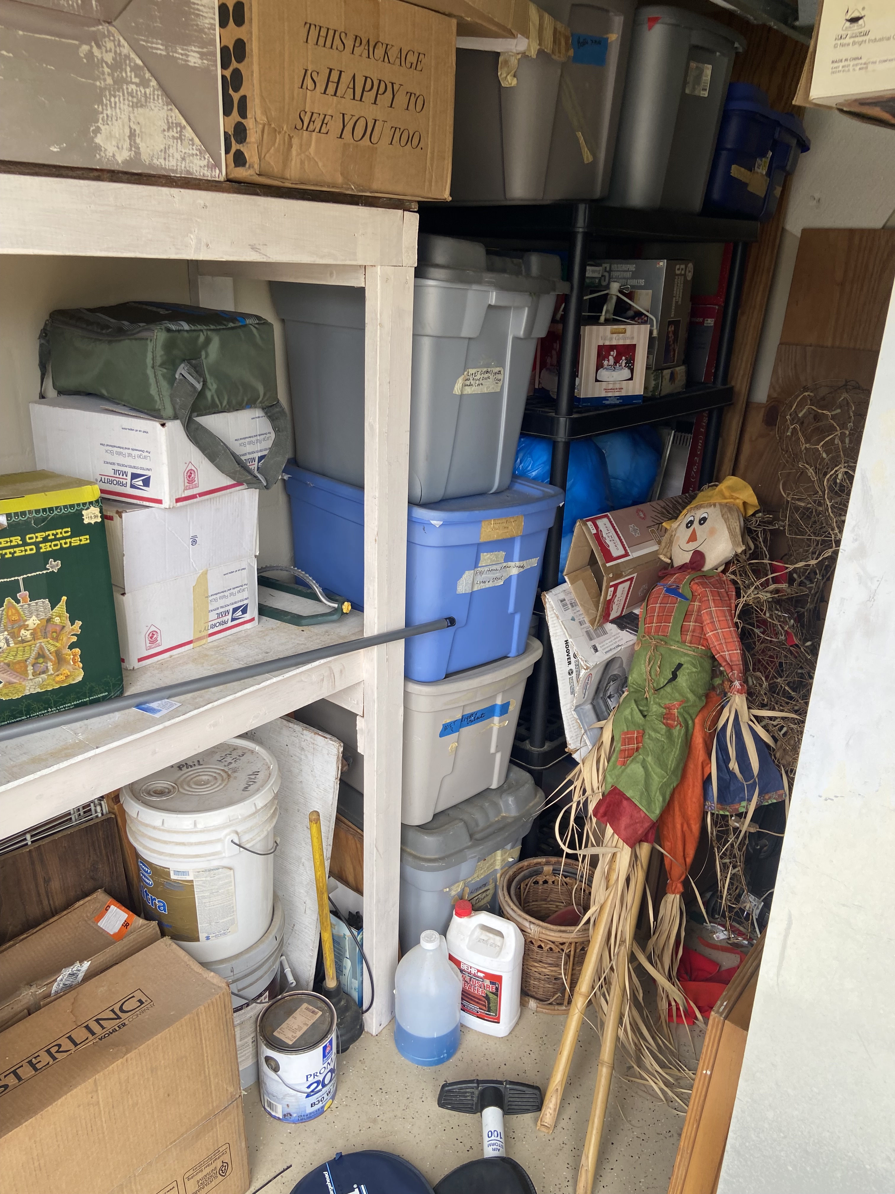 We have Burlington house hutch, marble top buffet, Vintage Collectibles, dining room table with four chairs, Hall tree, Steinbach Nutcracker from Germany, vintage hallway tables, art deco couch, decorator pieces, crystal, large fountain, mid-century armchairs, recliners, three stacking music box tables from Italy, Venus de Milo sculpture, pedestal, mid-century accent tables, curio, model ships, drop leaf dining room, table, and four chairs, marble top sofa table, artwork, CDs, VHS‘s, DVDs, albums, 78s, 45s and cassettes, 50 inch RCA Roku TV, stereo with turntable and cassette player, vintage oriental wooden birdcage, lamps, vases, green sofa, vintage pictures, sculptures, vacuums, room divider, bar area, kitchen, pampered chef, power juicer, Mikasa English Countryside dishes and serving set, vintage Hazel Aras hand painted glass set, glassware, toaster oven, knives and utensils, pots and pans, cookware, serving dishes, roosters, salt and pepper shakers, cups and dishes, canister sets, FA Pawla art Santa Barbara, we have a Christmas wonderland, Fontanini nativity set, department 56, village pieces, ornaments, Santa Claus figures, yard art, Christmas lights, dual patio glider, outdoor chairs, stressless recliner, patio set, storage bins, outdoor wall, art, outdoor cabinets and shelves, Thomasville bedroom set with dresser, high boy, nightstands and headboard, Butler writing desk, linens, high boy dresser, lingerie chest, jewelry boxes, vintage box phone, dolls, stuffed animals, throw pillows, OT fit briefs, shoes, hats, vintage hats, purses, bathroom items, early American dressers, high boy and nightstands, lamps, train sets, Viking Husqvarna sewing machine, bookcases, books, vintage and old books, old sheet music, vintage magazines, cameras, 35 mm cameras, digital cameras, vintage, Disney World, vintage camera accessories, shoe racks, we have hairdressers room, a large number of hairdresser supplies, hair dryer, hairdresser chair, cleaning supplies, art items, garage, three large Coleman storage chess, large Christmas tree, tennis rackets, tools, and much much more.