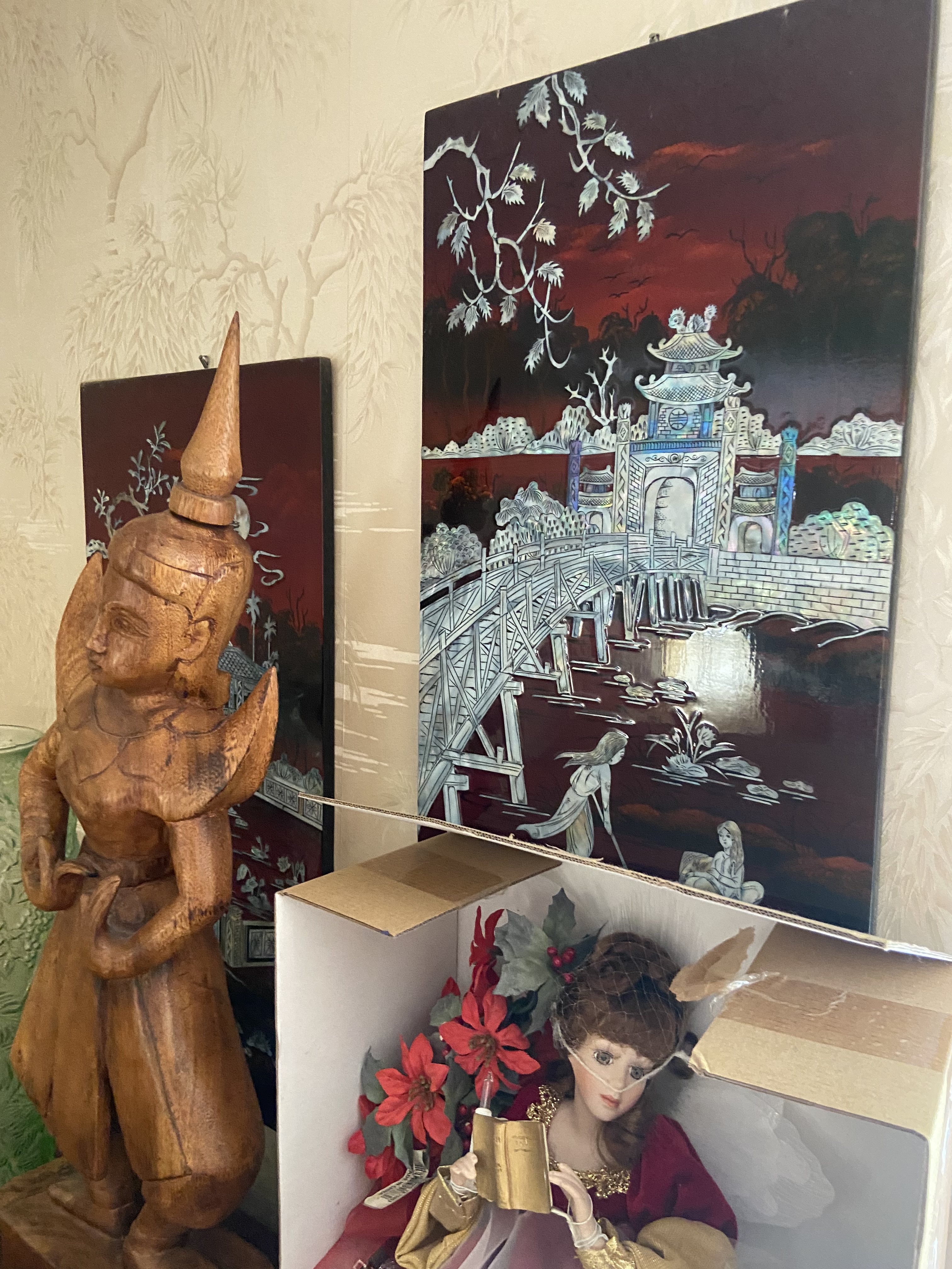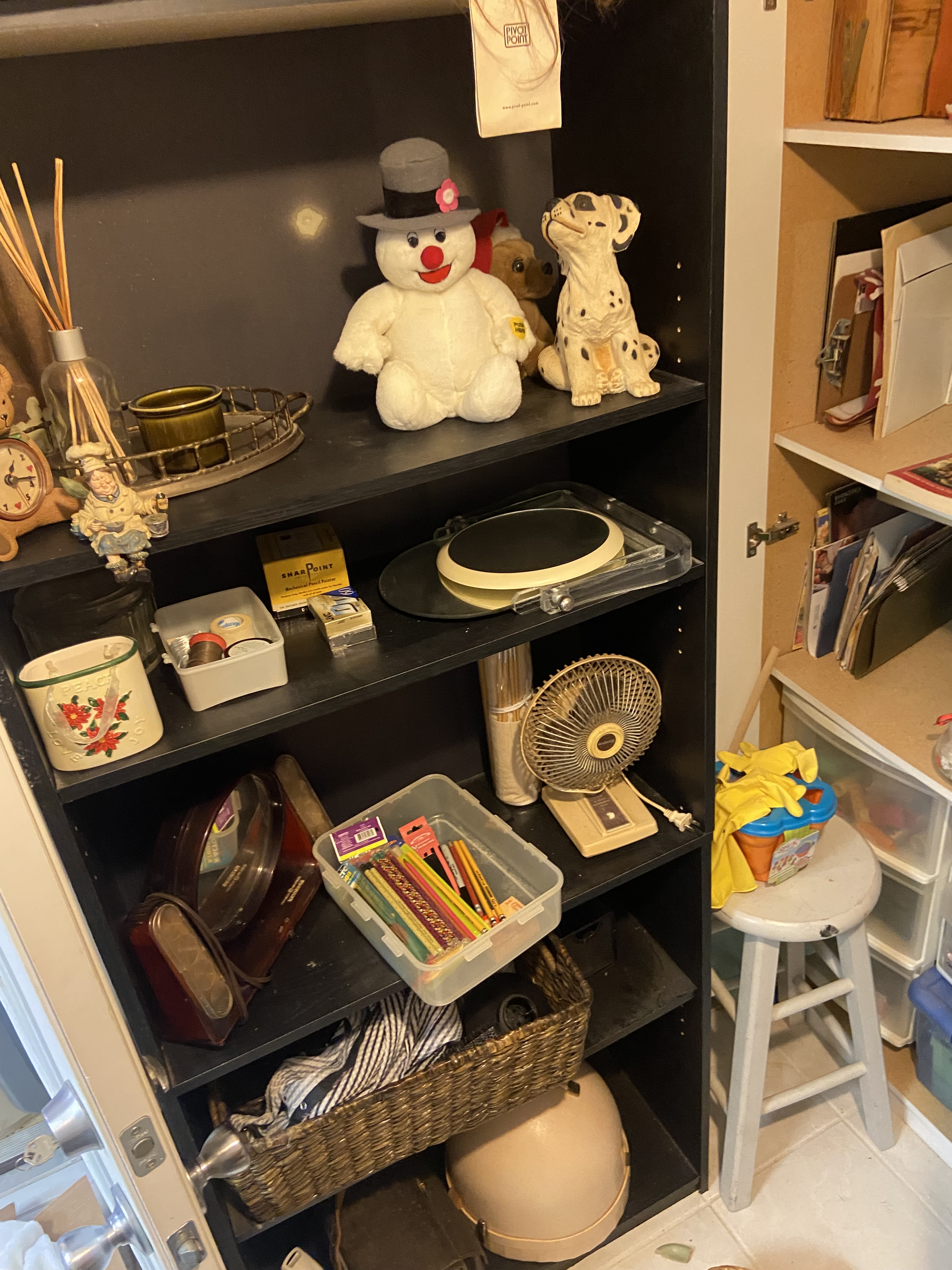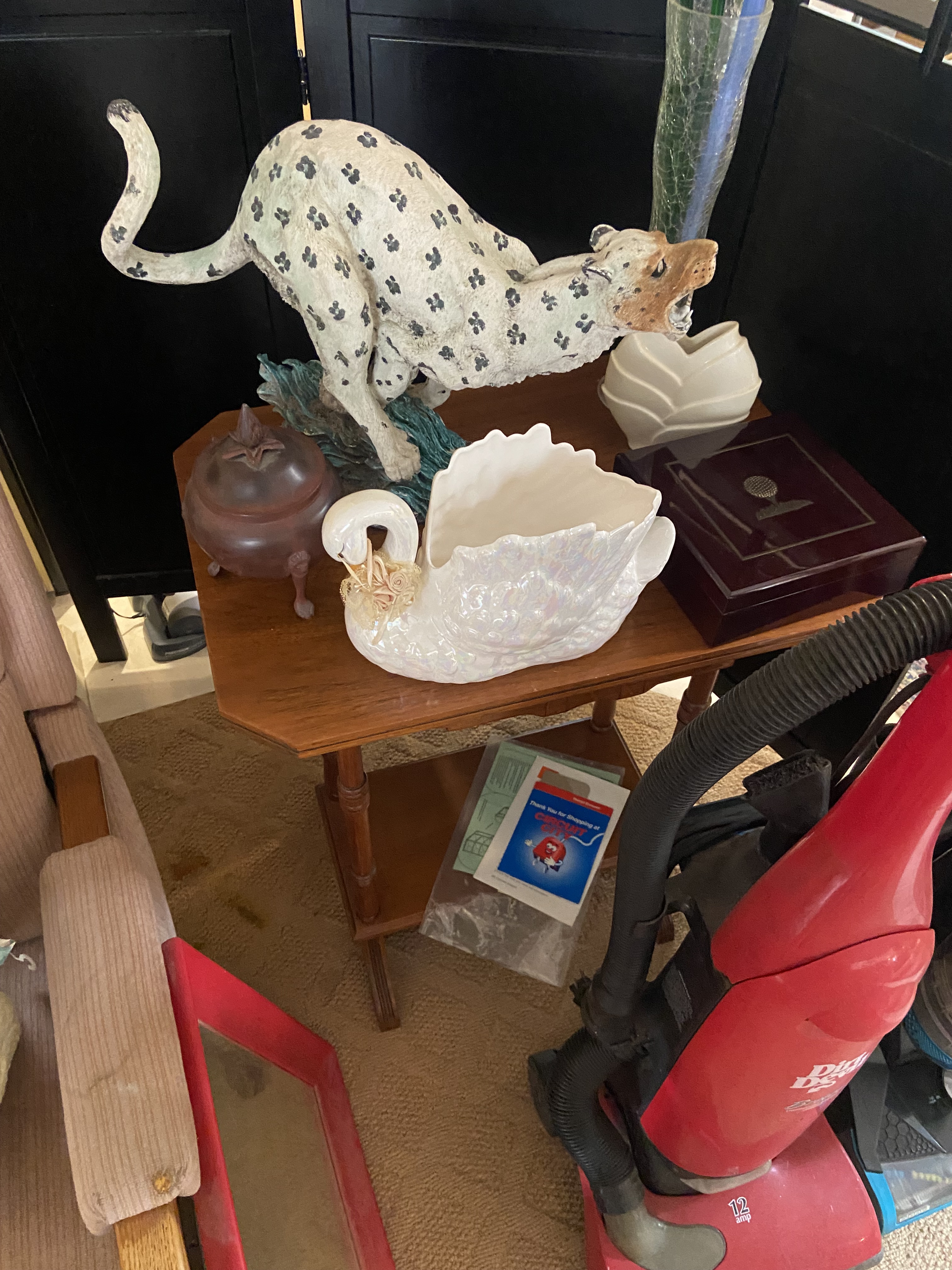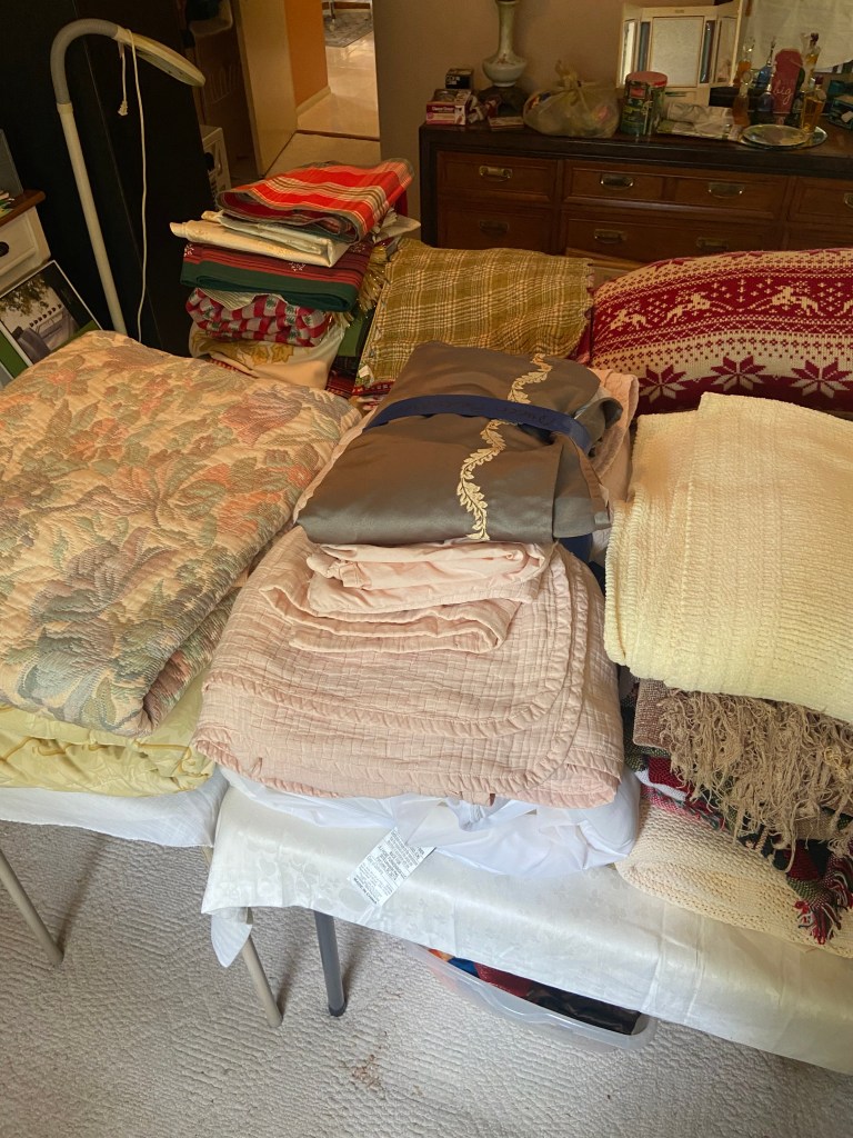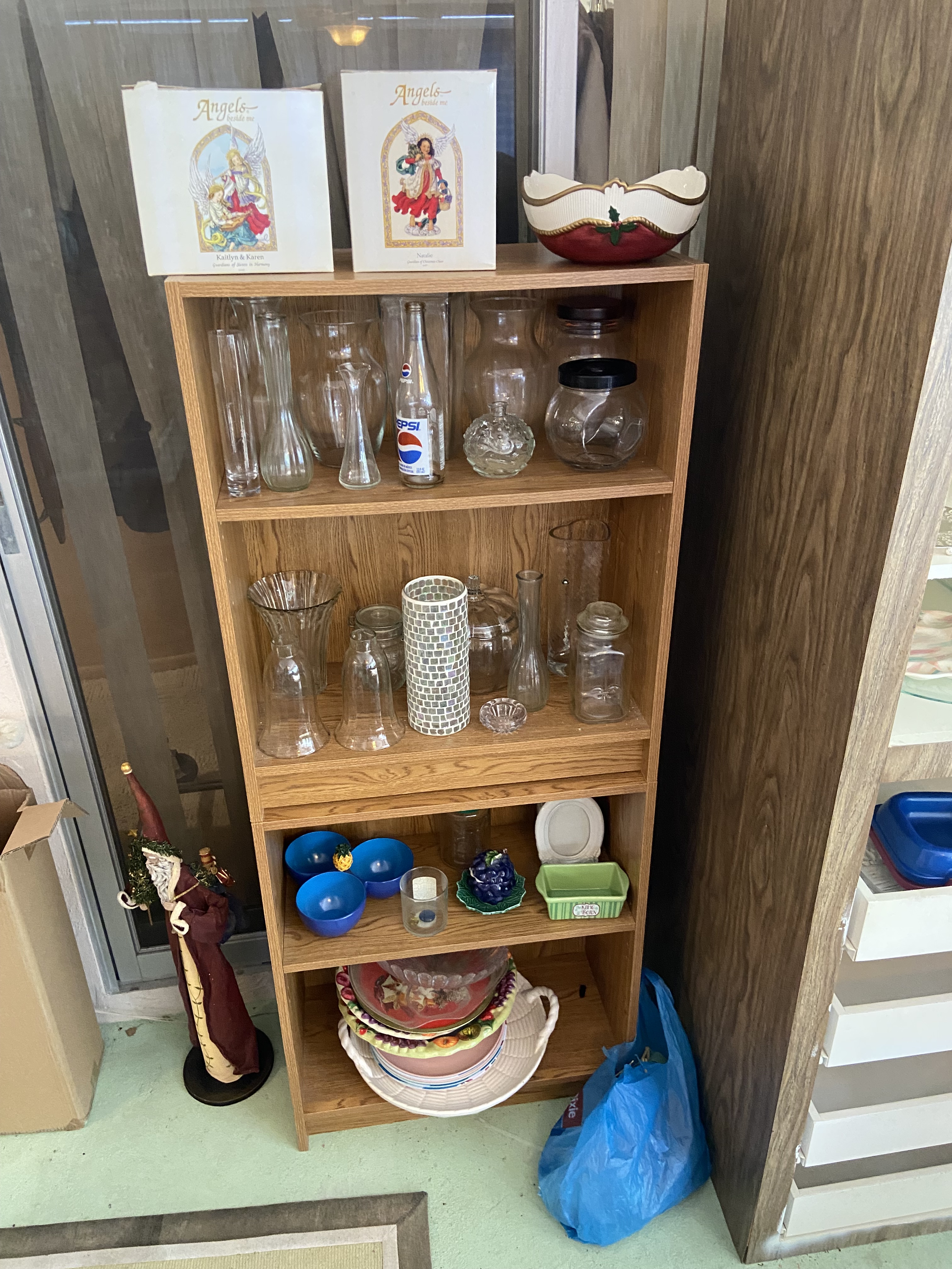 We have Burlington house hutch, marble top buffet, Vintage Collectibles, dining room table with four chairs, Hall tree, Steinbach Nutcracker from Germany, vintage hallway tables, art deco couch, decorator pieces, crystal, large fountain, mid-century armchairs, recliners, three stacking music box tables from Italy, Venus de Milo sculpture, pedestal, mid-century accent tables, curio, model ships, drop leaf dining room, table, and four chairs, marble top sofa table, artwork, CDs, VHS‘s, DVDs, albums, 78s, 45s and cassettes, 50 inch RCA Roku TV, stereo with turntable and cassette player, vintage oriental wooden birdcage, lamps, vases, green sofa, vintage pictures, sculptures, vacuums, room divider, bar area, kitchen, pampered chef, power juicer, Mikasa English Countryside dishes and serving set, vintage Hazel Aras hand painted glass set, glassware, toaster oven, knives and utensils, pots and pans, cookware, serving dishes, roosters, salt and pepper shakers, cups and dishes, canister sets, FA Pawla art Santa Barbara, we have a Christmas wonderland, Fontanini nativity set, department 56, village pieces, ornaments, Santa Claus figures, yard art, Christmas lights, dual patio glider, outdoor chairs, stressless recliner, patio set, storage bins, outdoor wall, art, outdoor cabinets and shelves, Thomasville bedroom set with dresser, high boy, nightstands and headboard, Butler writing desk, linens, high boy dresser, lingerie chest, jewelry boxes, vintage box phone, dolls, stuffed animals, throw pillows, OT fit briefs, shoes, hats, vintage hats, purses, bathroom items, early American dressers, high boy and nightstands, lamps, train sets, Viking Husqvarna sewing machine, bookcases, books, vintage and old books, old sheet music, vintage magazines, cameras, 35 mm cameras, digital cameras, vintage, Disney World, vintage camera accessories, shoe racks, we have hairdressers room, a large number of hairdresser supplies, hair dryer, hairdresser chair, cleaning supplies, art items, garage, three large Coleman storage chess, large Christmas tree, tennis rackets, tools, and much much more.