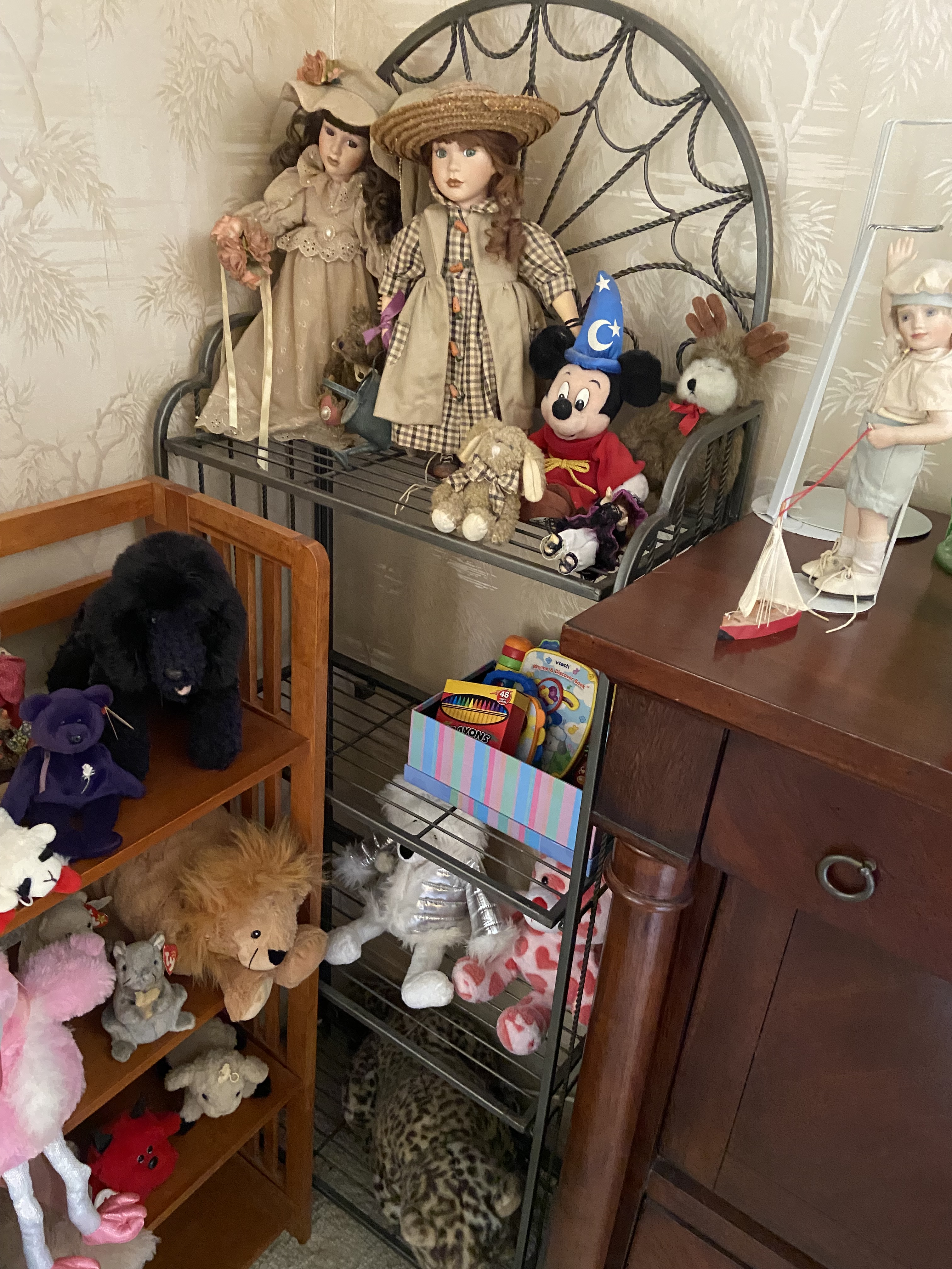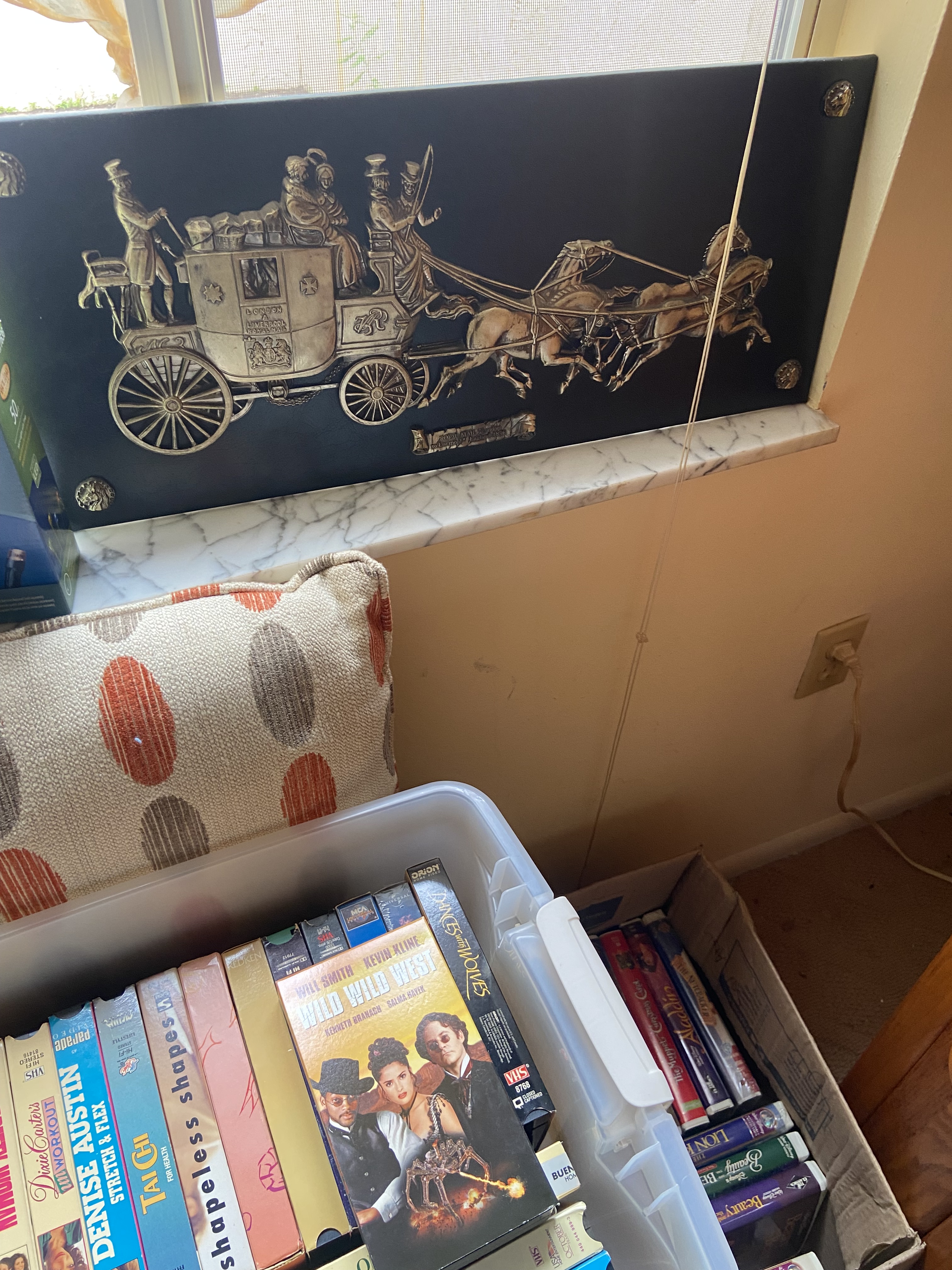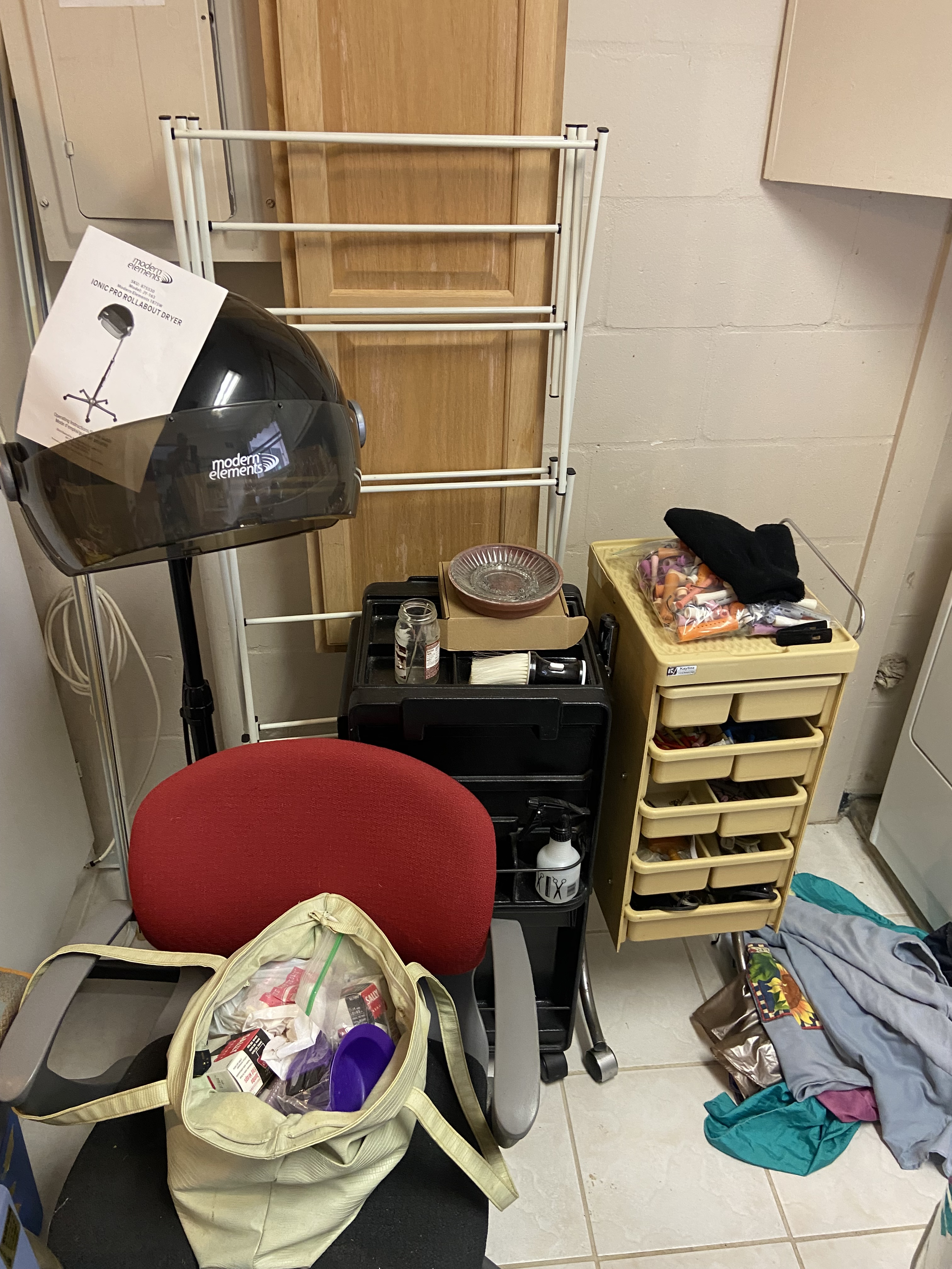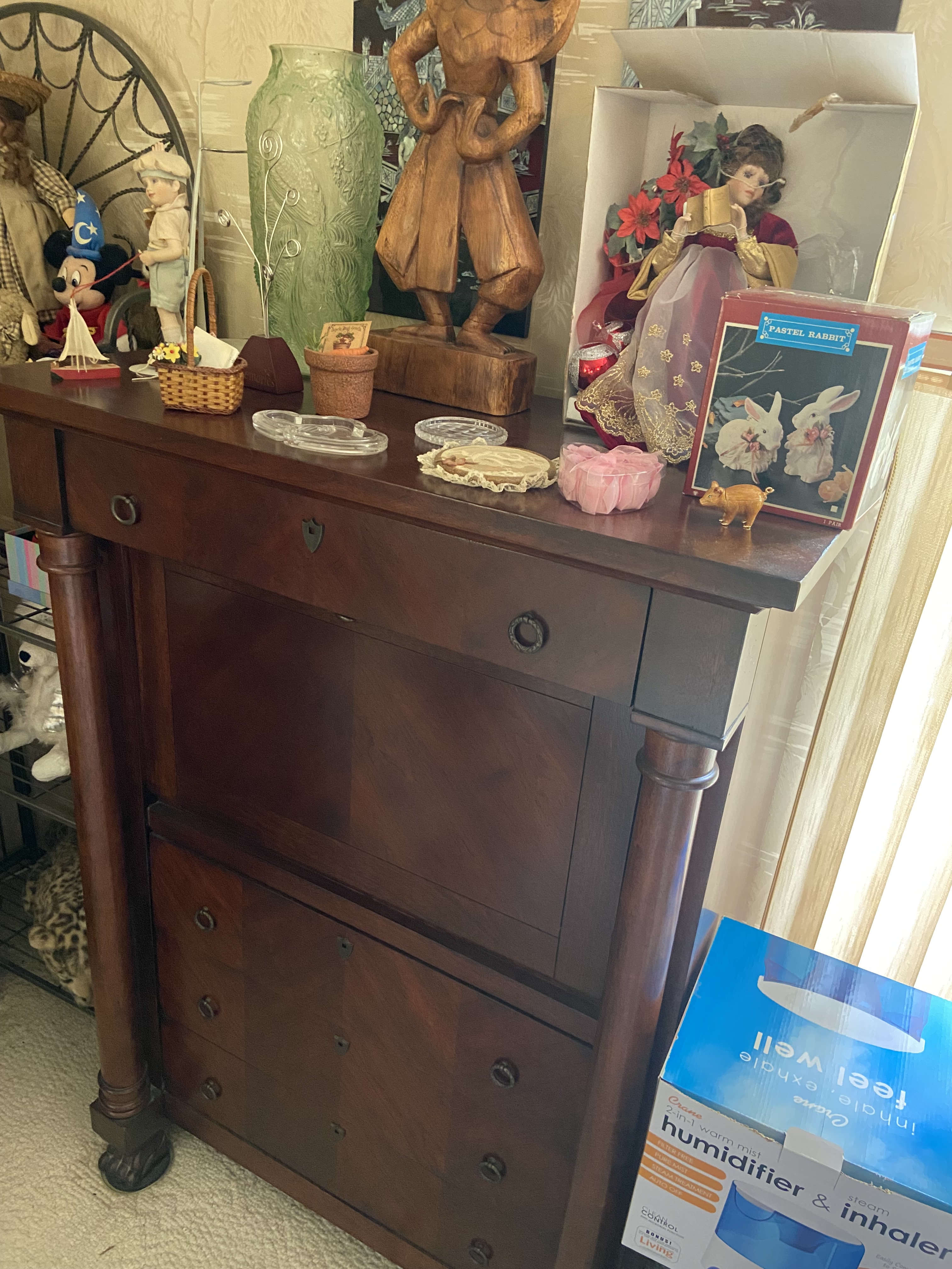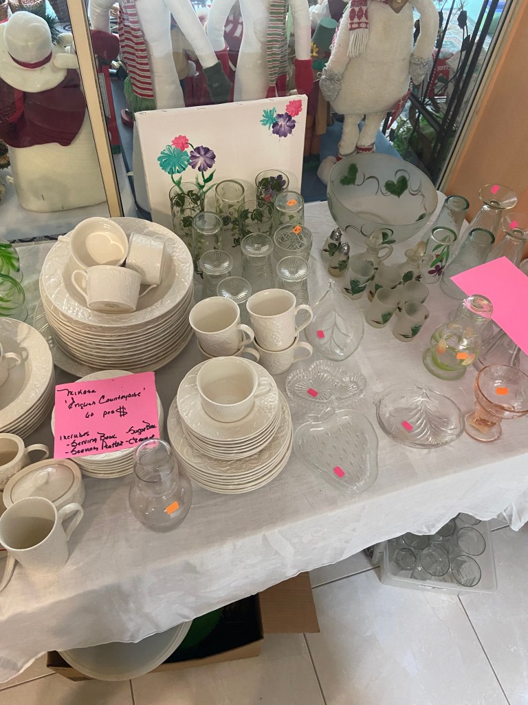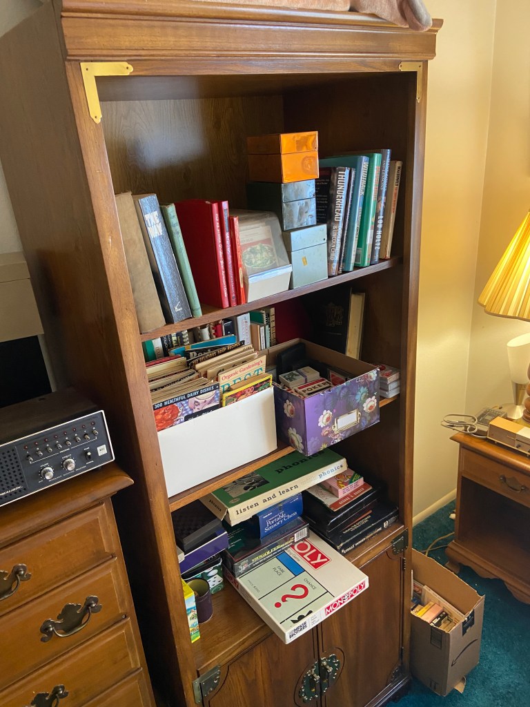 We have Burlington house hutch, marble top buffet, Vintage Collectibles, dining room table with four chairs, Hall tree, Steinbach Nutcracker from Germany, vintage hallway tables, art deco couch, decorator pieces, crystal, large fountain, mid-century armchairs, recliners, three stacking music box tables from Italy, Venus de Milo sculpture, pedestal, mid-century accent tables, curio, model ships, drop leaf dining room, table, and four chairs, marble top sofa table, artwork, CDs, VHS‘s, DVDs, albums, 78s, 45s and cassettes, 50 inch RCA Roku TV, stereo with turntable and cassette player, vintage oriental wooden birdcage, lamps, vases, green sofa, vintage pictures, sculptures, vacuums, room divider, bar area, kitchen, pampered chef, power juicer, Mikasa English Countryside dishes and serving set, vintage Hazel Aras hand painted glass set, glassware, toaster oven, knives and utensils, pots and pans, cookware, serving dishes, roosters, salt and pepper shakers, cups and dishes, canister sets, FA Pawla art Santa Barbara, we have a Christmas wonderland, Fontanini nativity set, department 56, village pieces, ornaments, Santa Claus figures, yard art, Christmas lights, dual patio glider, outdoor chairs, stressless recliner, patio set, storage bins, outdoor wall, art, outdoor cabinets and shelves, Thomasville bedroom set with dresser, high boy, nightstands and headboard, Butler writing desk, linens, high boy dresser, lingerie chest, jewelry boxes, vintage box phone, dolls, stuffed animals, throw pillows, OT fit briefs, shoes, hats, vintage hats, purses, bathroom items, early American dressers, high boy and nightstands, lamps, train sets, Viking Husqvarna sewing machine, bookcases, books, vintage and old books, old sheet music, vintage magazines, cameras, 35 mm cameras, digital cameras, vintage, Disney World, vintage camera accessories, shoe racks, we have hairdressers room, a large number of hairdresser supplies, hair dryer, hairdresser chair, cleaning supplies, art items, garage, three large Coleman storage chess, large Christmas tree, tennis rackets, tools, and much much more.